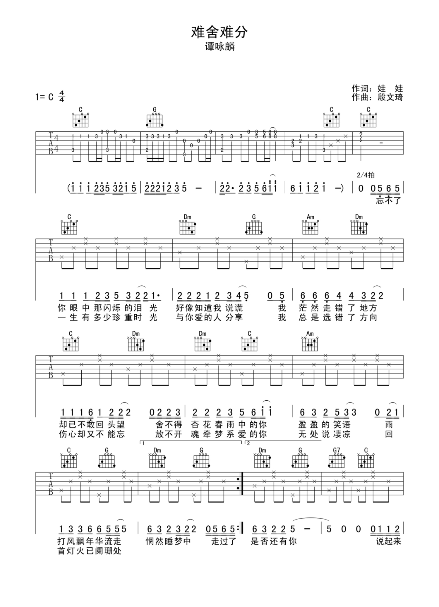 难舍难分吉他谱 - 谭咏麟 - C调吉他弹唱谱