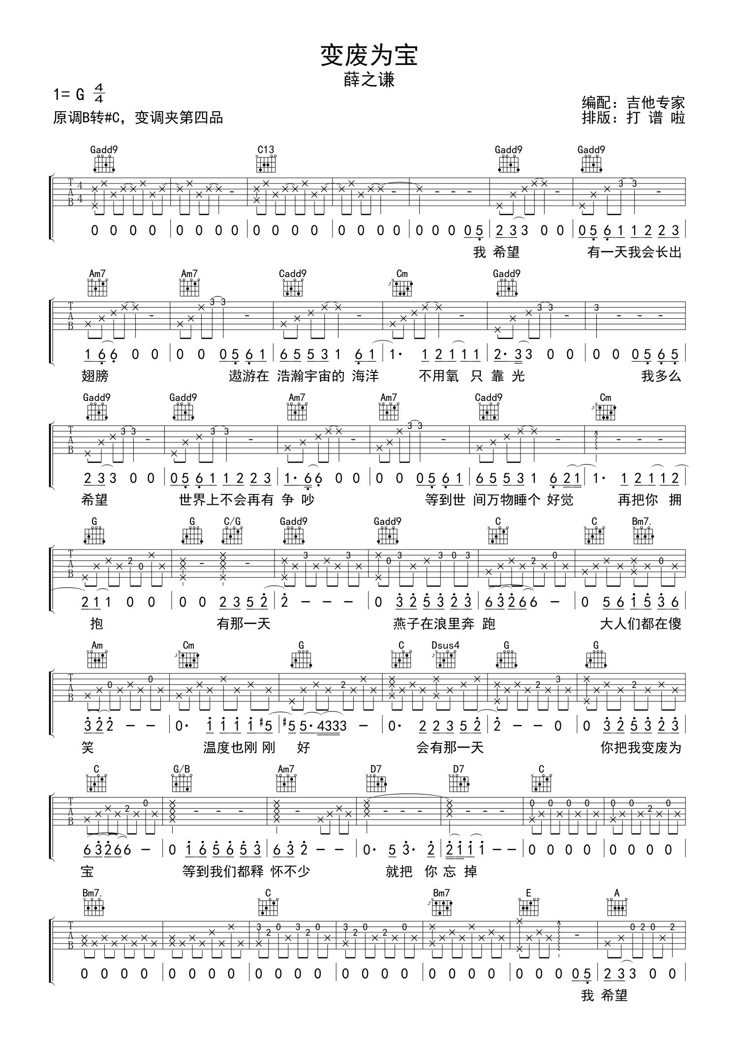 曲谱介绍: 薛之谦《变废为宝》吉他谱_G调吉他弹唱谱_免翻页版