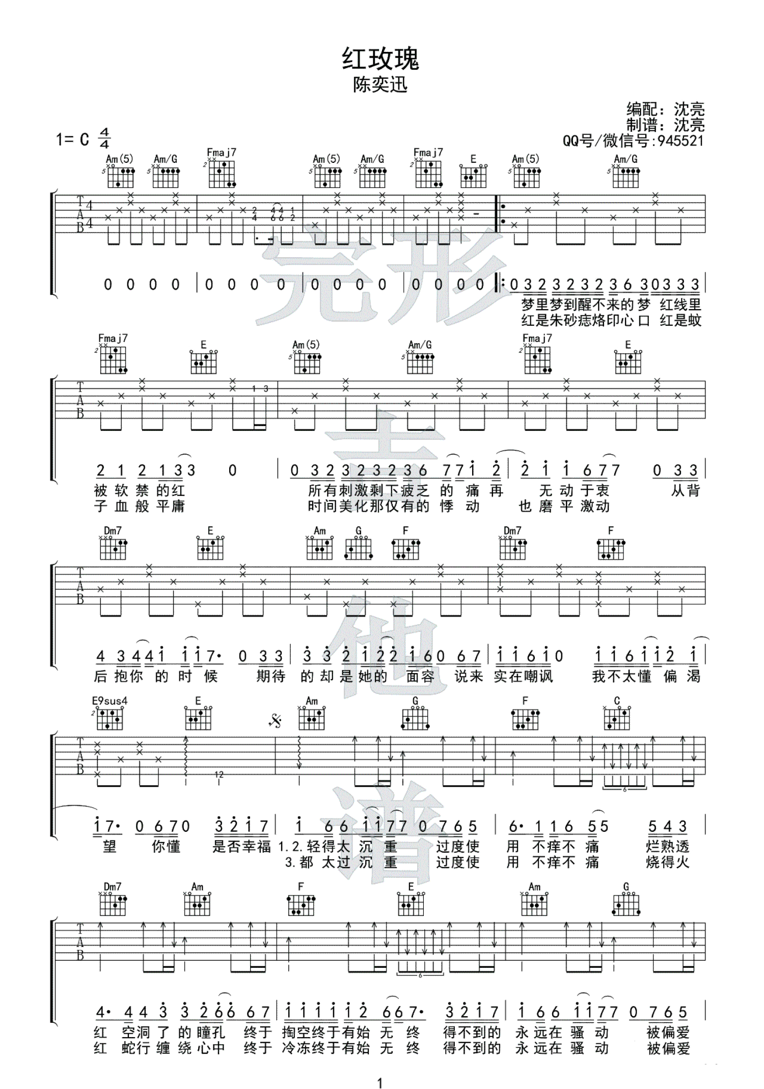 曲谱介绍: 陈奕迅《红玫瑰》吉他谱,C调指法,陈奕迅的一首经典歌曲,粤语版是《白玫瑰》,我们都有爱而不得的时刻,有时候,一首曲填了两首词,其实不过是,一种深情,两种欢喜。一首《红玫瑰》,唱出男人的隐忍多情,暗潮汹涌的感觉。随谱附上配套吉他弹唱演示视频,琴友们参照练习。