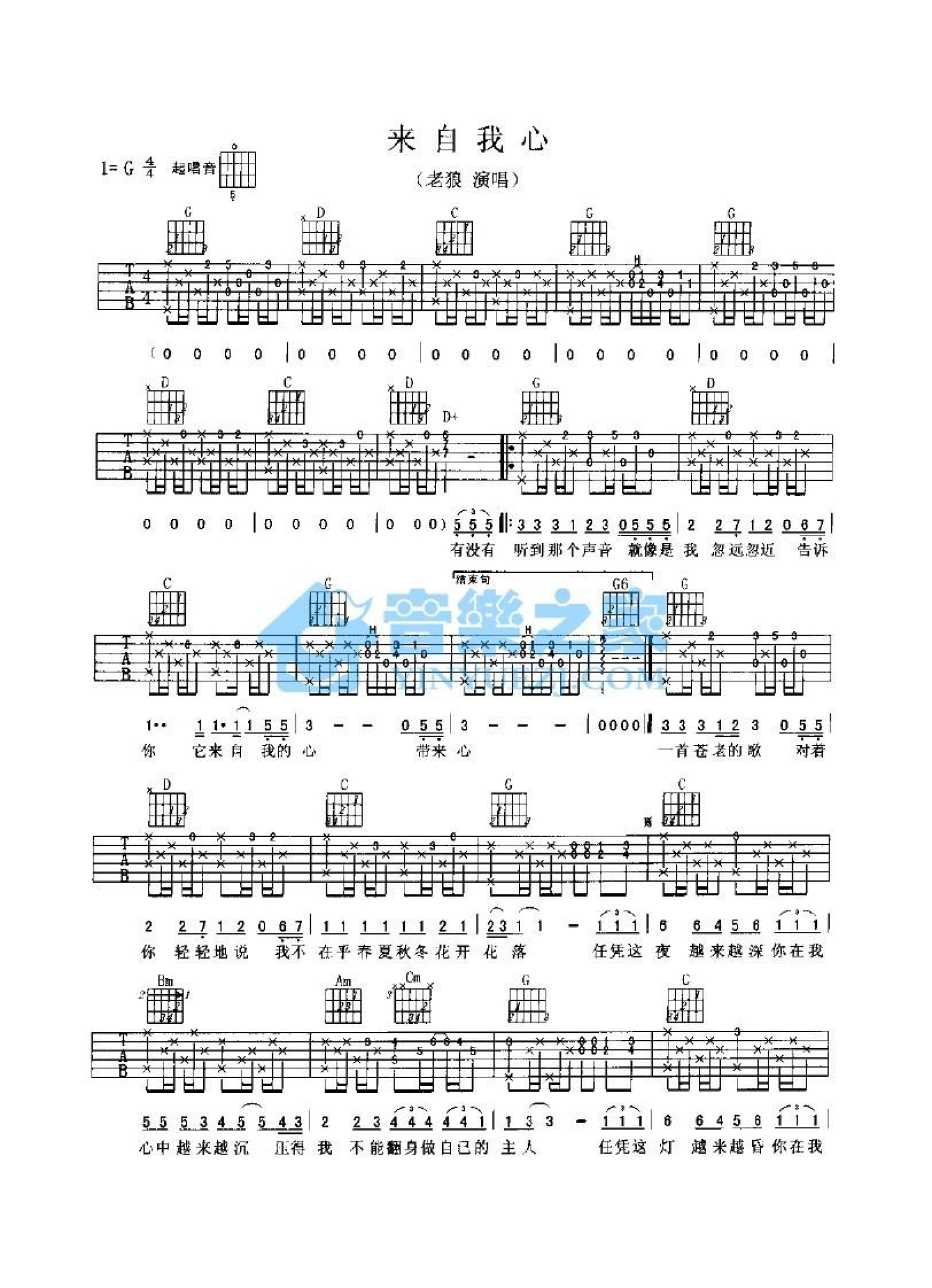 曲谱介绍: 老狼《来自我心》吉他谱_G调吉他弹唱谱