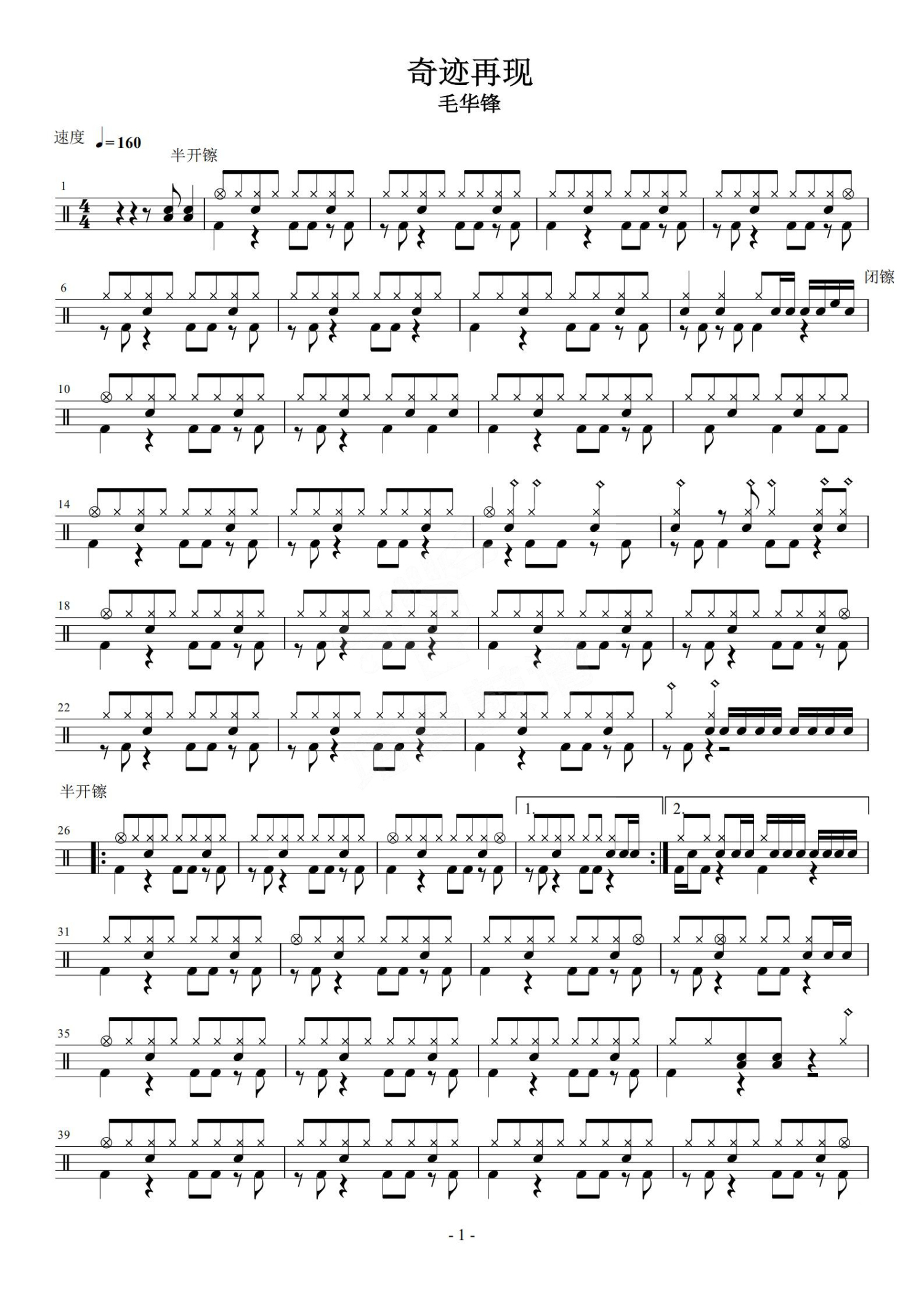 曲谱介绍: 毛华锋《奇迹再现》鼓谱_架子鼓谱