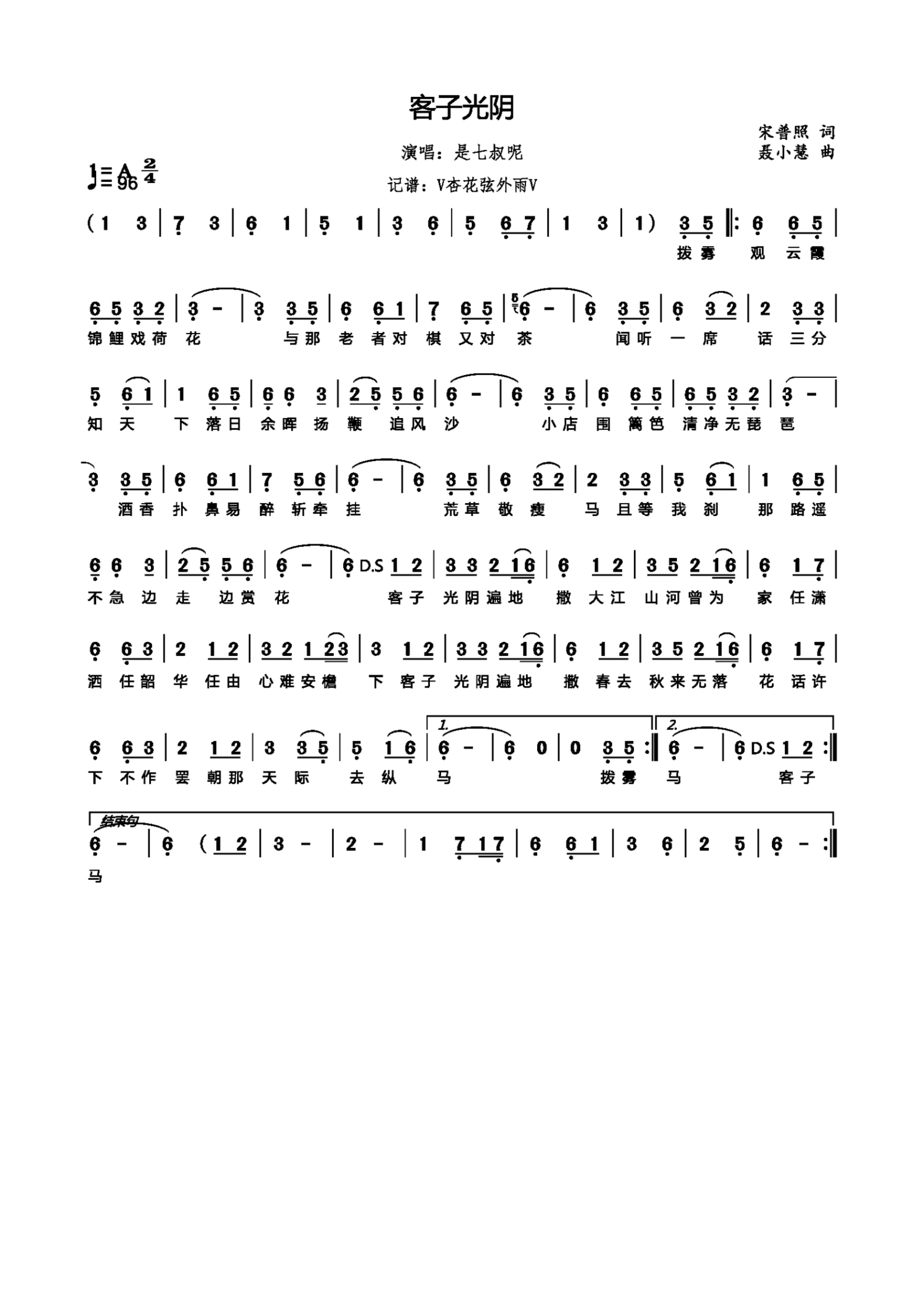 曲谱介绍: 是七叔呢《客子光阴》歌词_简谱