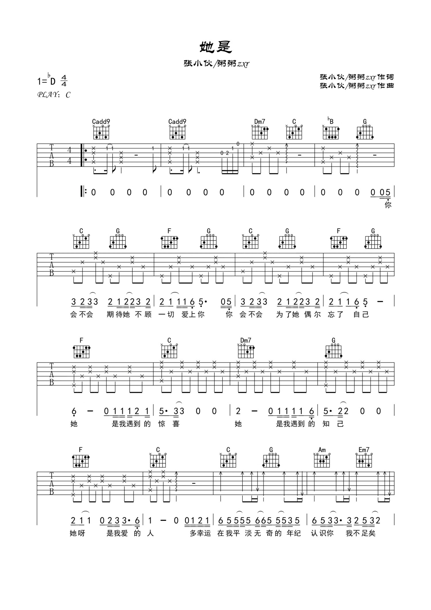 曲谱介绍: 张小伙《她是》吉他谱_C调吉他弹唱谱