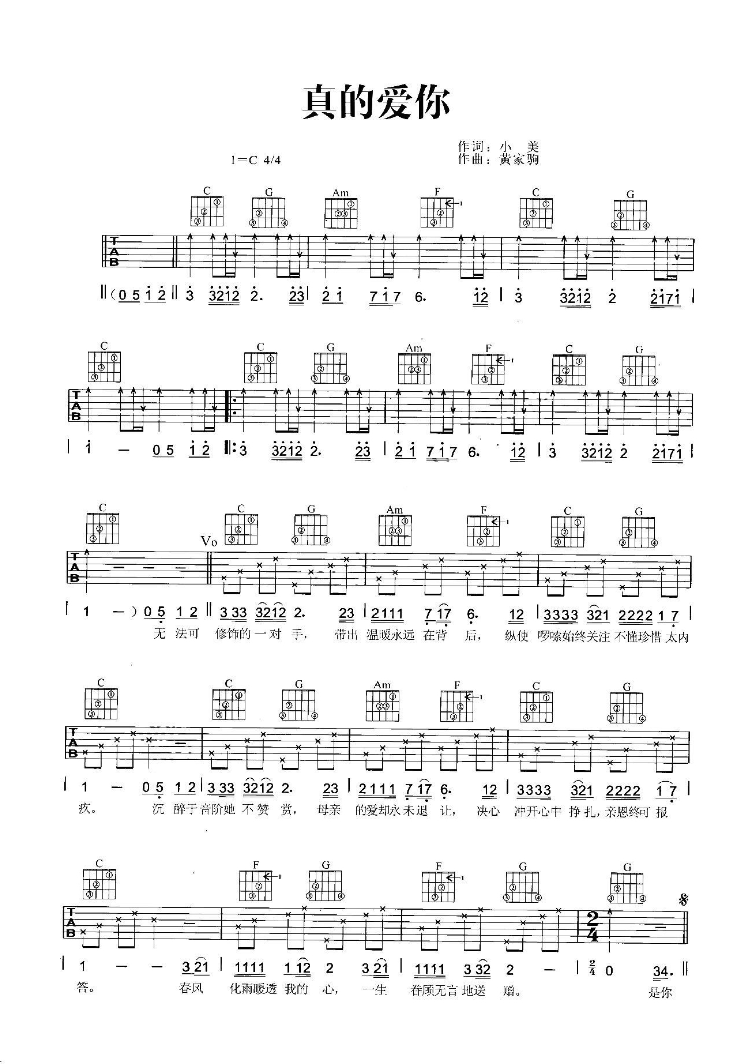曲谱介绍: 黄家驹《真的爱你》吉他谱_C调吉他弹唱谱