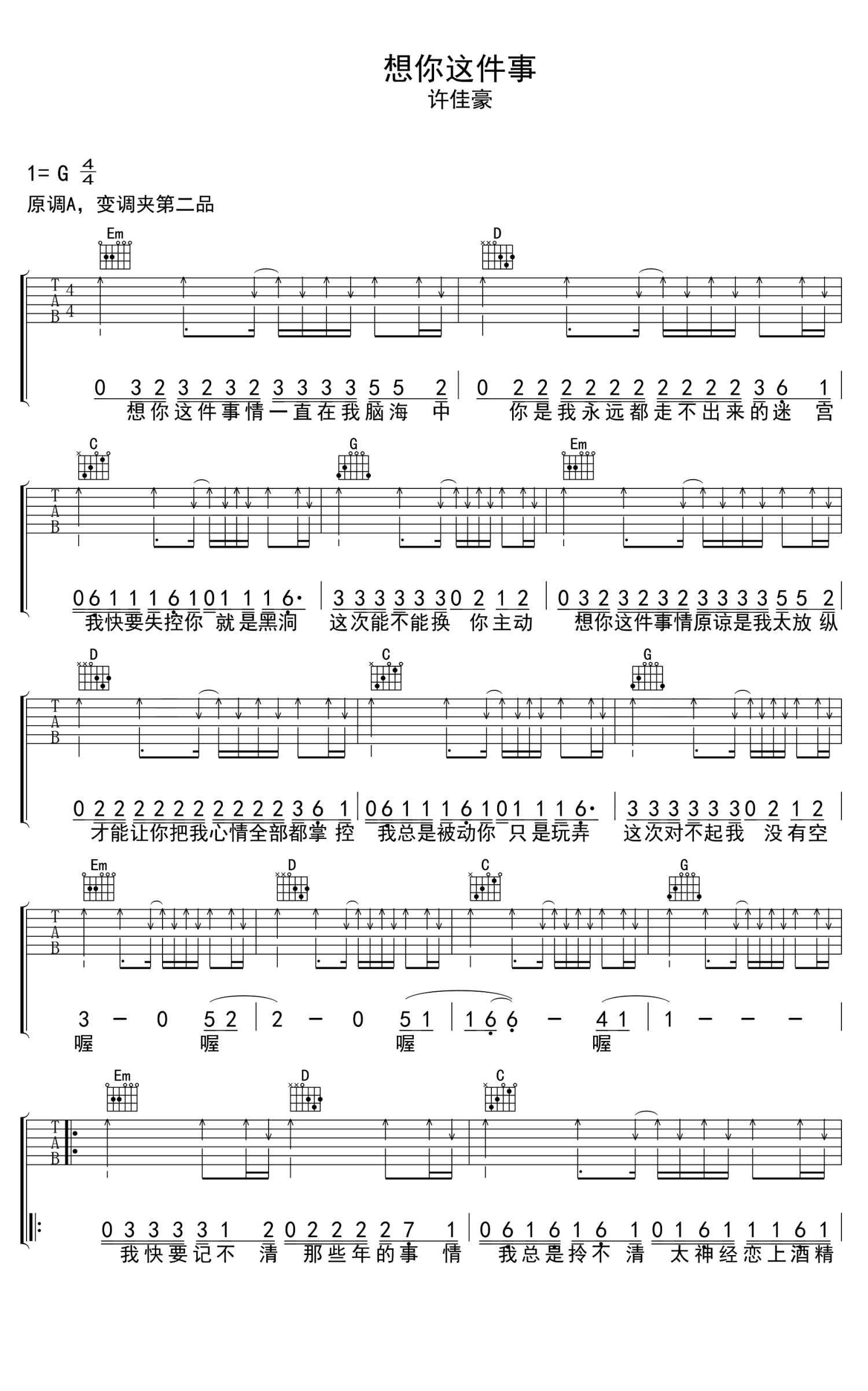 想你这件事吉他谱 - 烟(许佳豪) - G调吉他弹唱谱