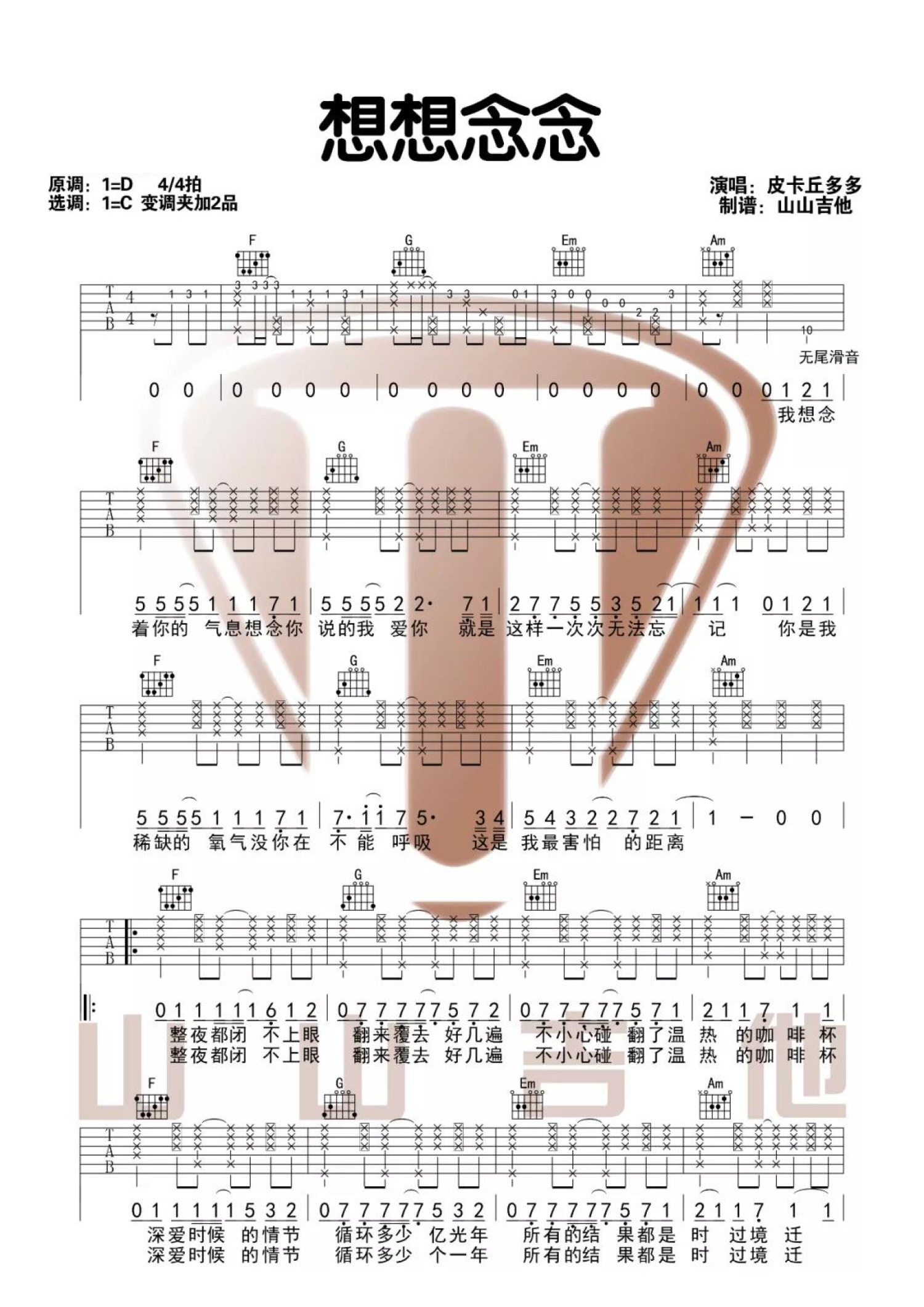 曲谱介绍: 皮卡丘多多《想想念念》吉他谱_C调吉他弹唱谱