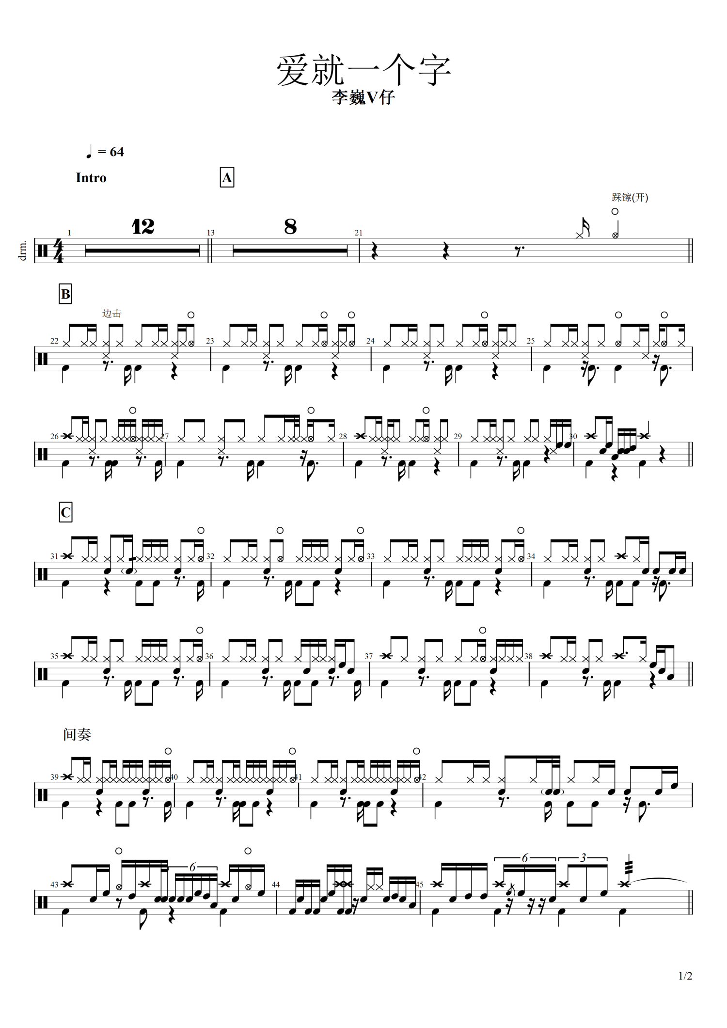 • 爱就一个字鼓谱 - 李巍V仔 - 架子鼓谱 - 弹唱版第1张