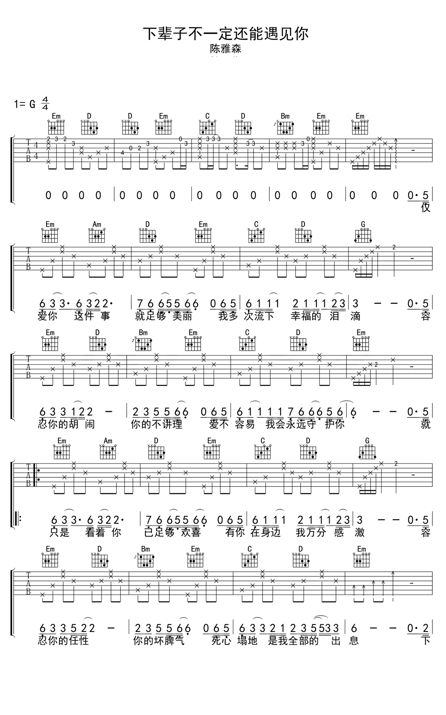 曲谱介绍: 陈雅森《下辈子不一定还能遇见你》吉他谱_G调吉他弹唱谱