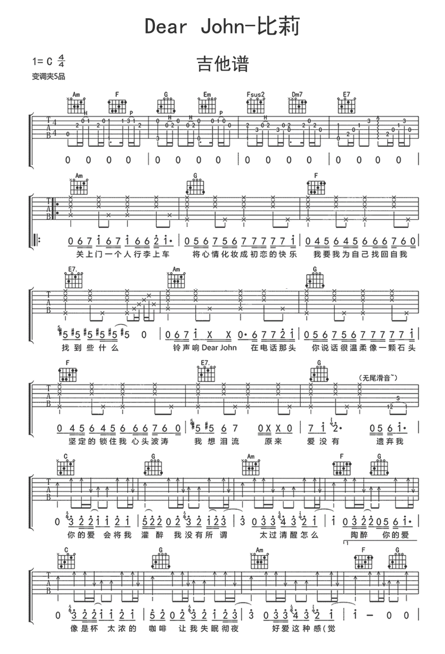 曲谱介绍: 比莉的经典歌曲《DearJohn》吉他谱C调完整版。DearJohn歌曲的原调是F调的,男生用吉他谱弹唱建议变调夹夹0到5品,女生可以夹5品唱原调,具体的音高可以根据自己的嗓音调整.