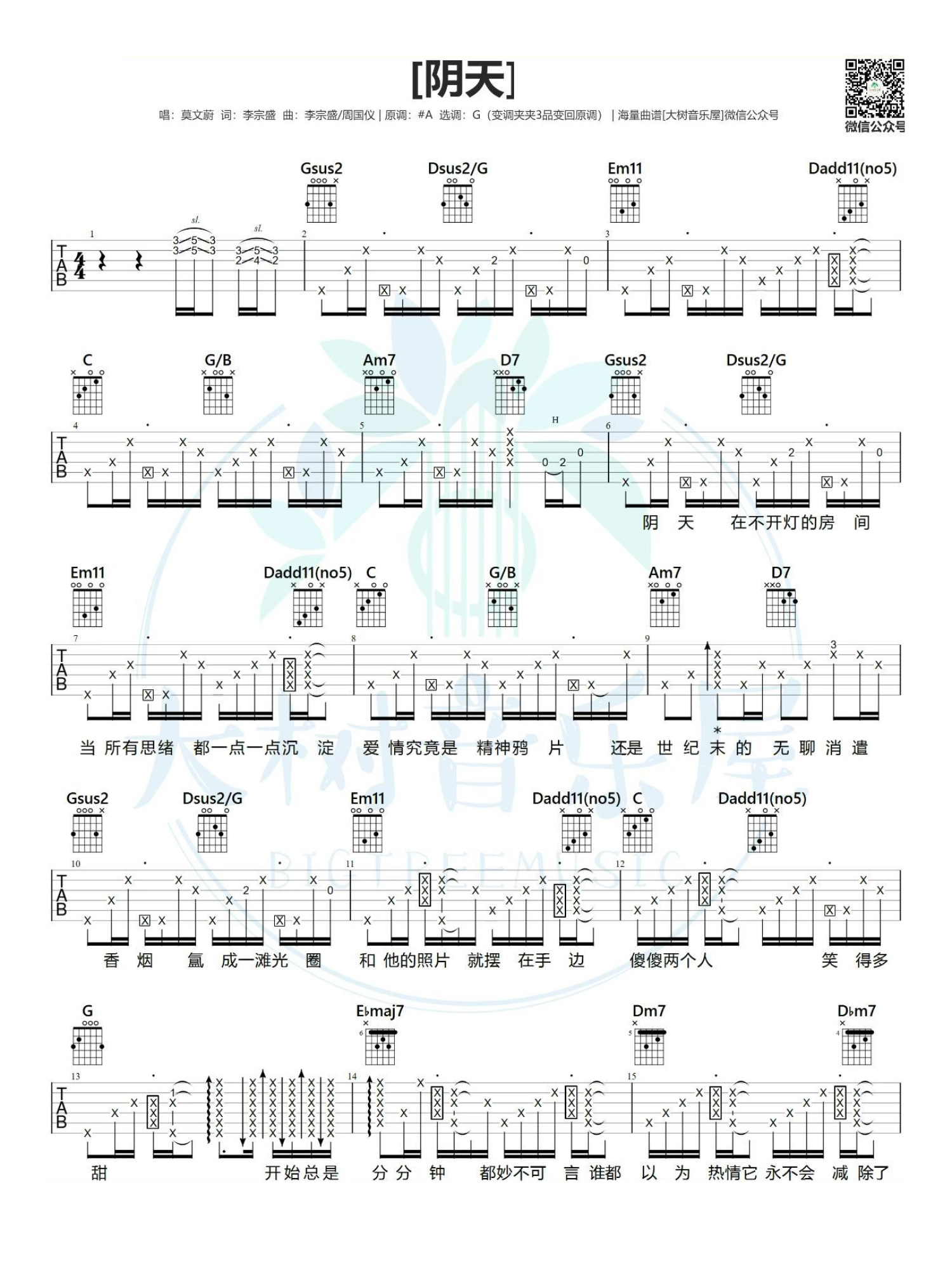 曲谱介绍: 莫文蔚魅惑迷人的嗓音唱着下雨天的慵懒和落寞,让人共鸣深刻。爱情究竟是必不可少还是无病呻吟?歌曲没有撕心裂肺,却能让人痛彻心扉。《阴天》吉他弹唱视频教程来自大树音乐编配《阴天》吉他谱,附弹唱教学讲解(演示视频点这里),大家可以通过这首歌学习下拍弦的节奏型。