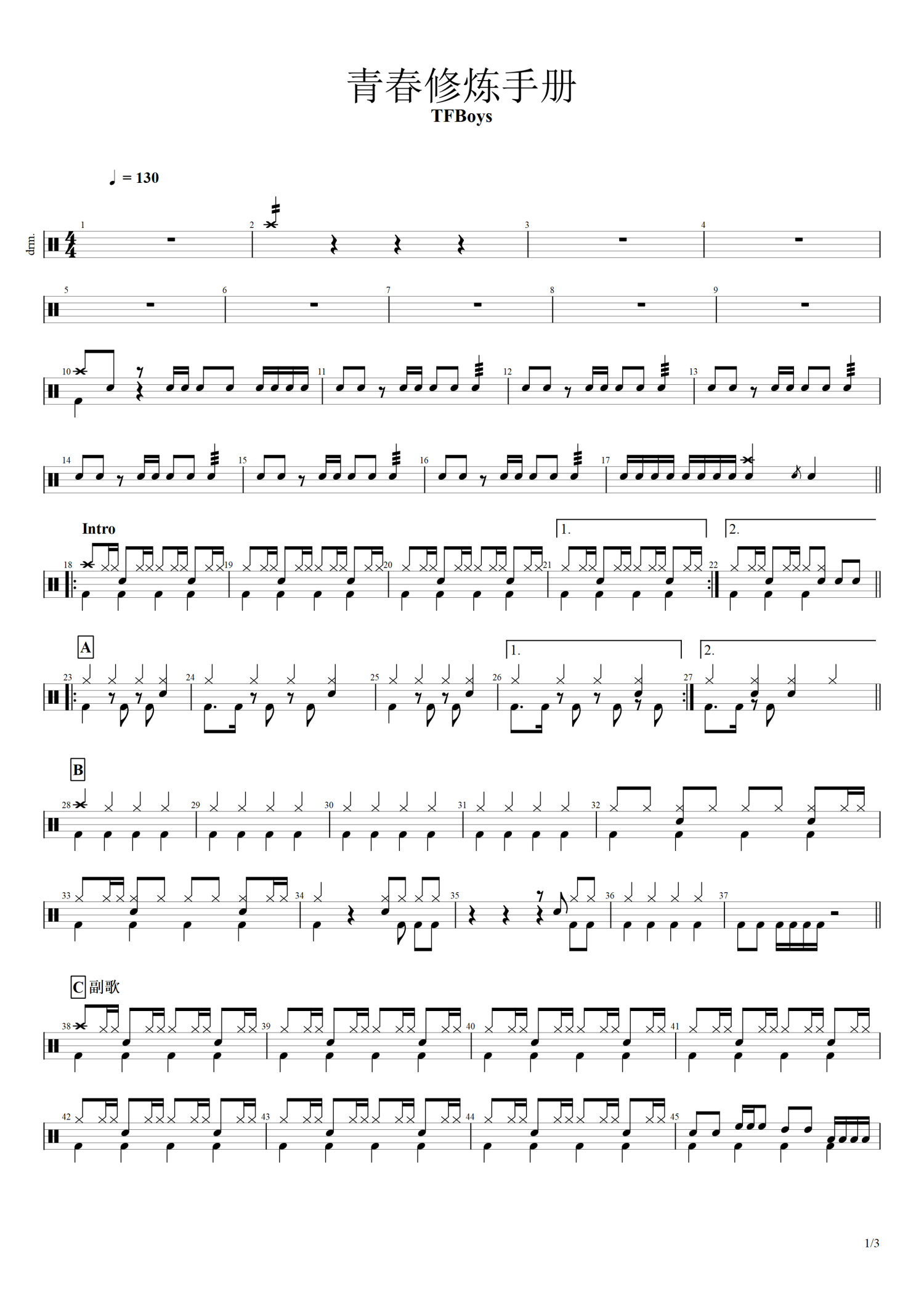 • 青春修炼手册鼓谱 - TFBOYS - 架子鼓谱第1张