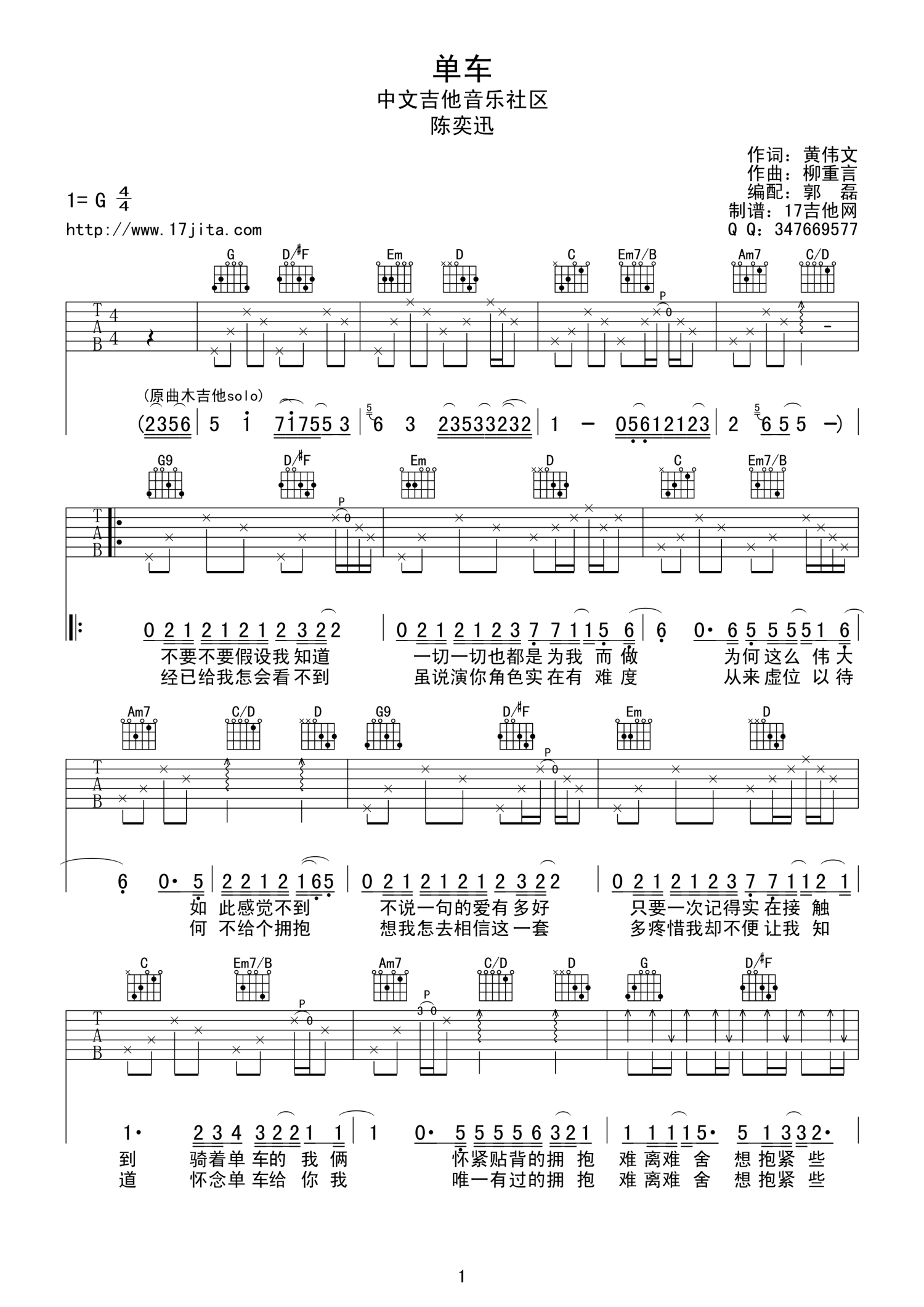 曲谱介绍: 陈奕迅《单车》吉他谱G调高清版