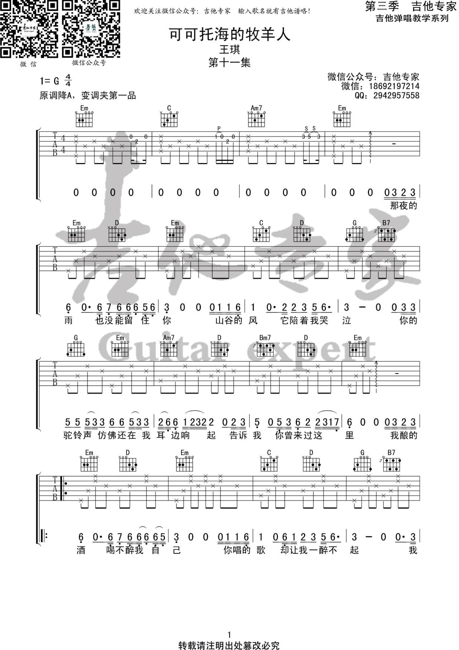 曲谱介绍: 王琪《可可托海的牧羊人》吉他谱_G调吉他弹唱谱