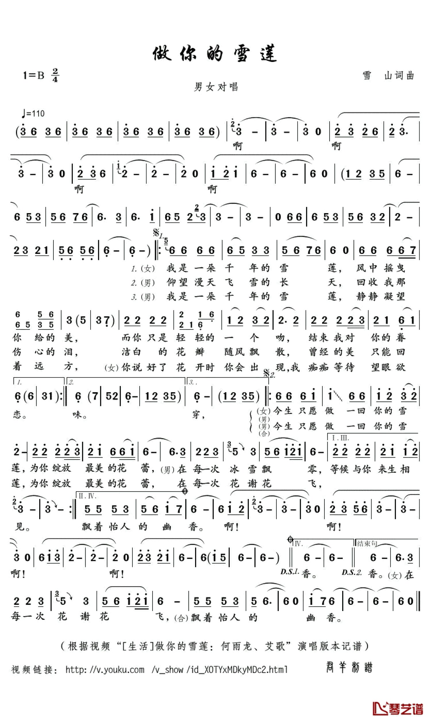 曲谱介绍: 何雨龙/艾歌《做你的雪莲》歌词_简谱