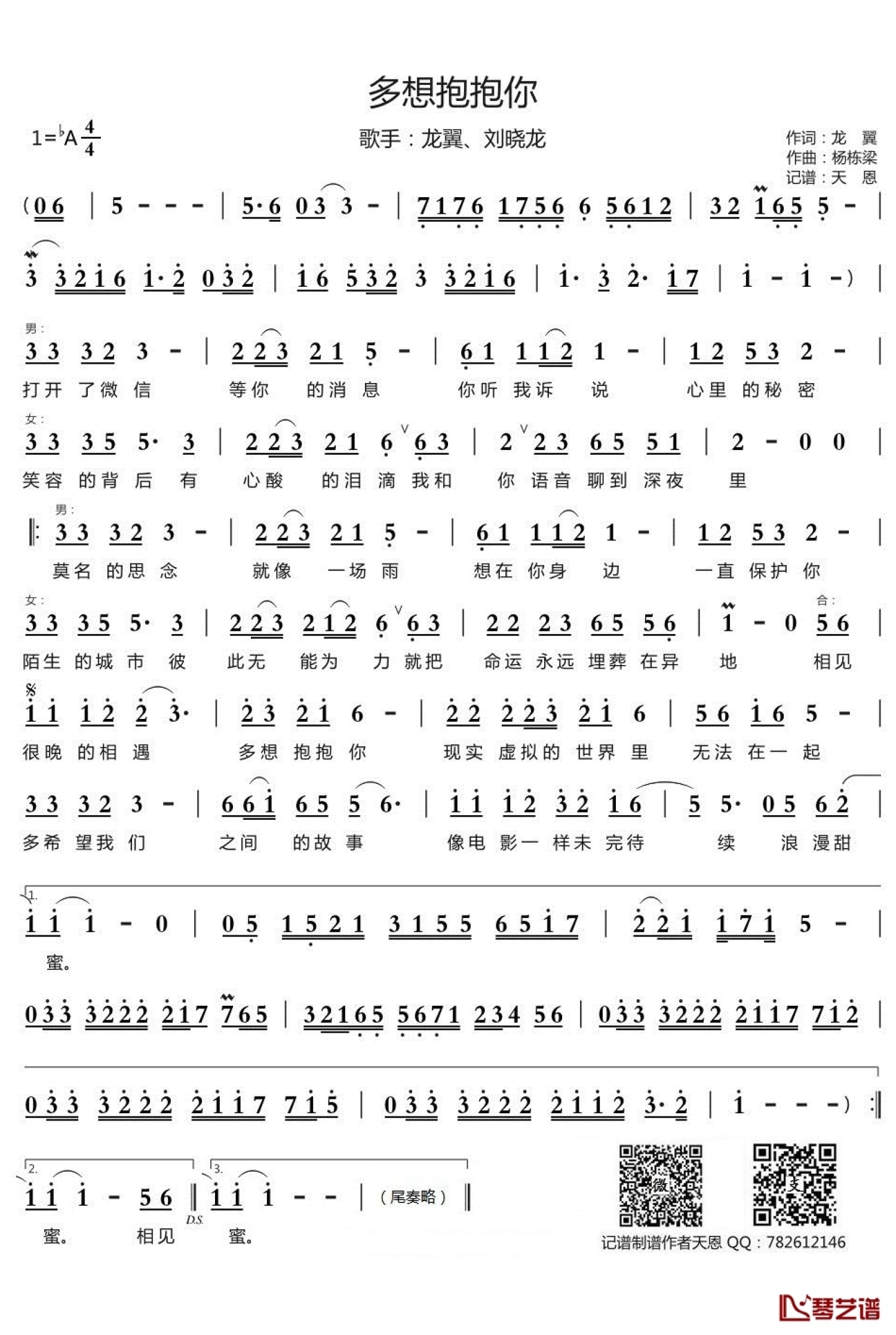 曲谱介绍: 龙翼/刘晓龙《多想抱抱你》歌词_简谱