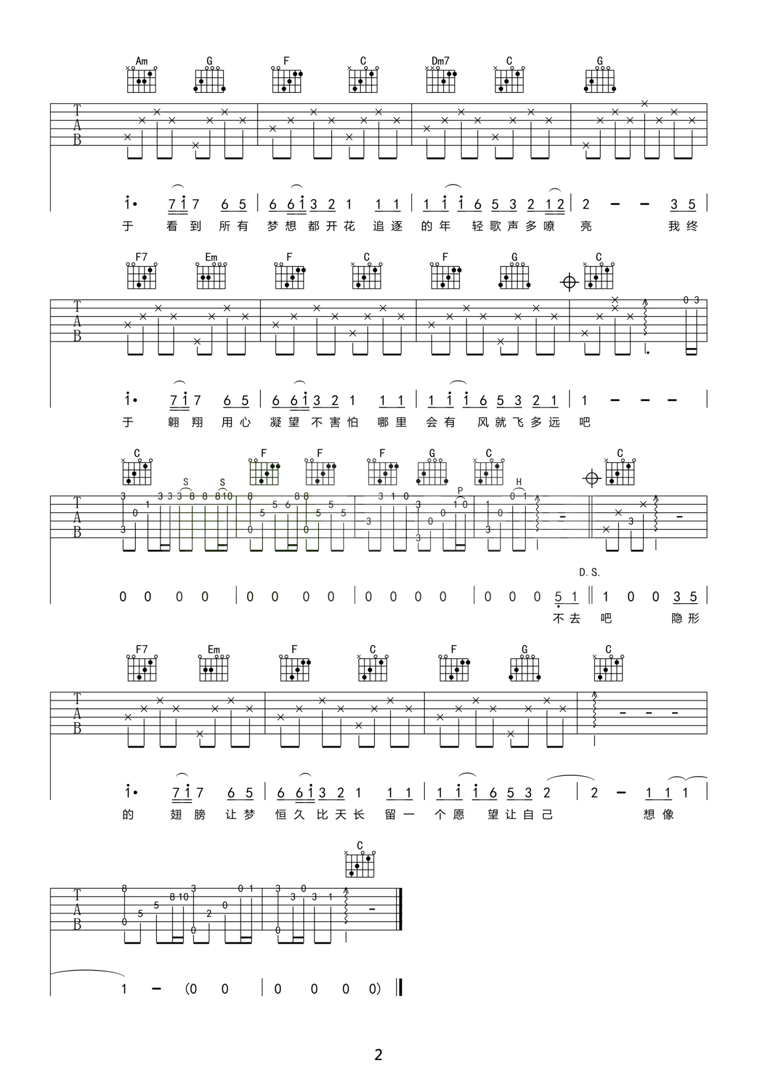 曲谱介绍: 张韶涵《隐形的翅膀》吉他谱 C调高清版
