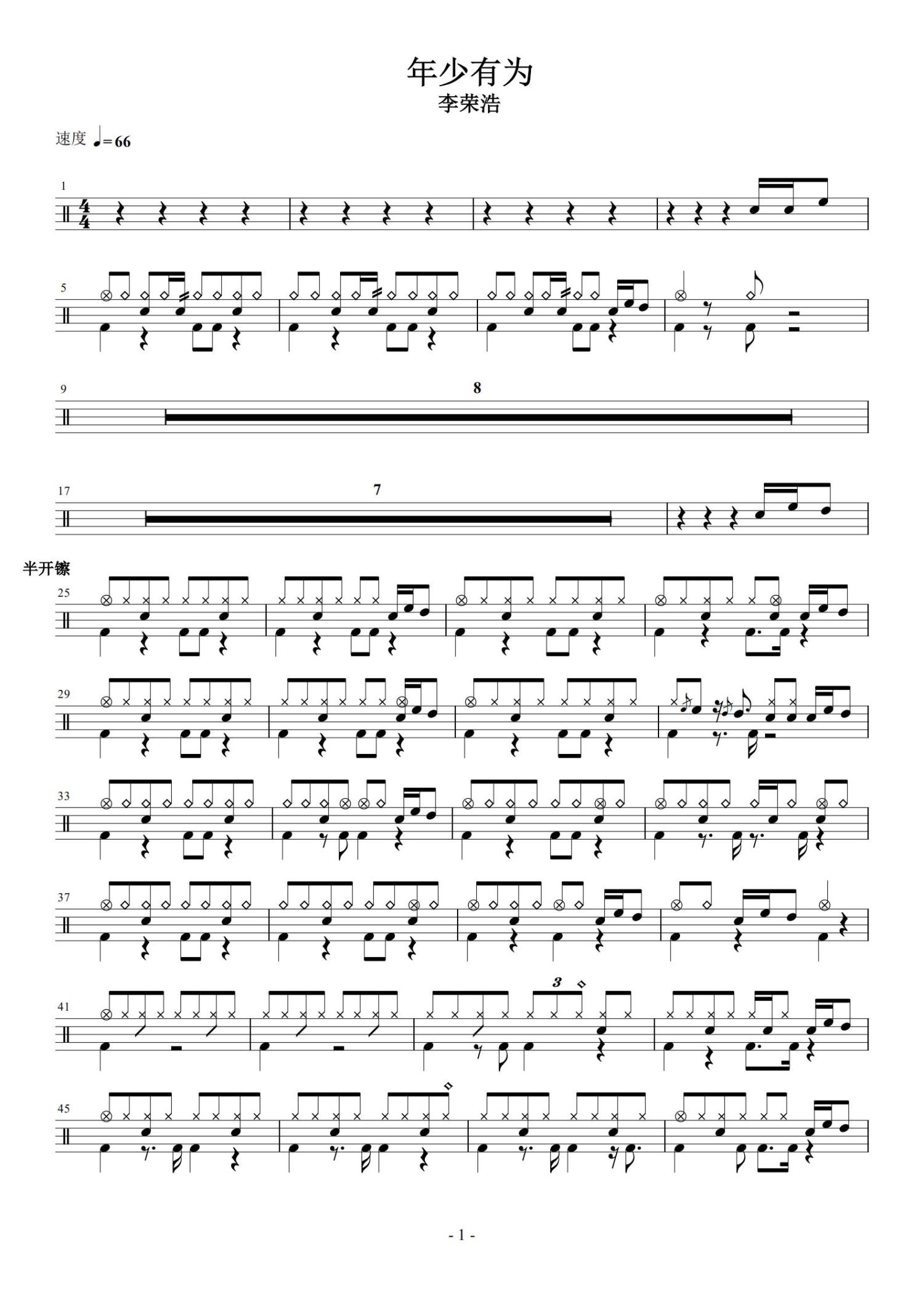 • 年少有为鼓谱 - 李荣浩 - 架子鼓谱第1张