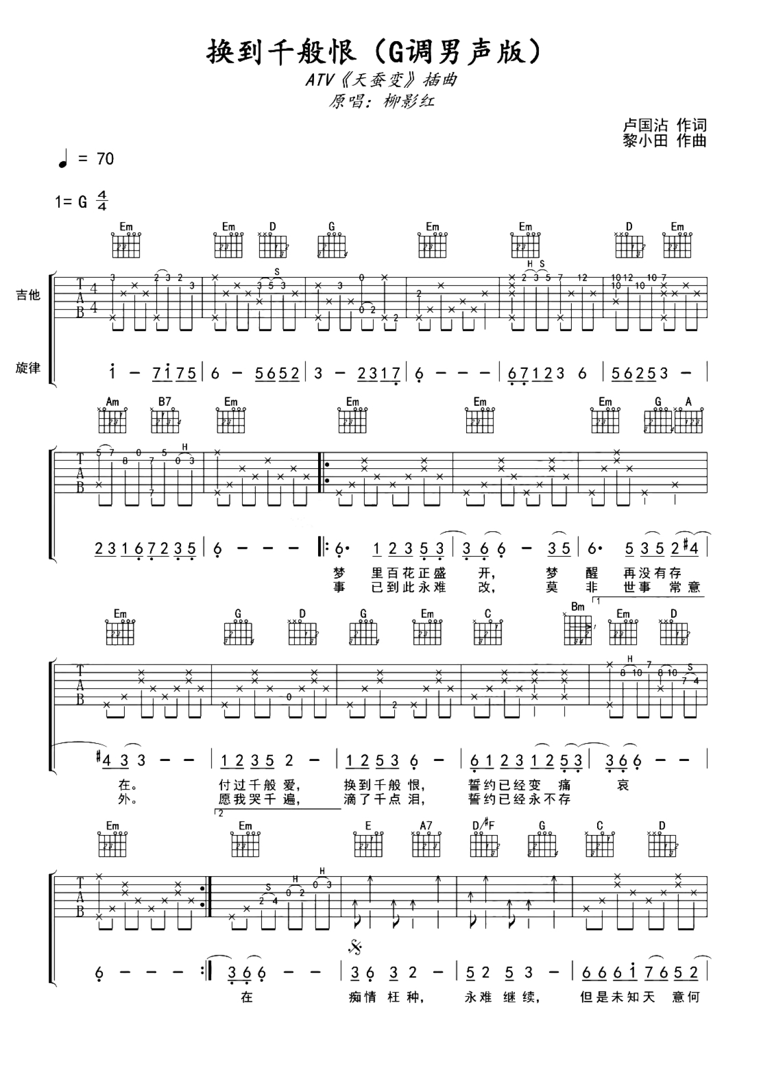 曲谱介绍: 换到千般恨(香港ATV丽的电视剧《天蚕变》插曲)