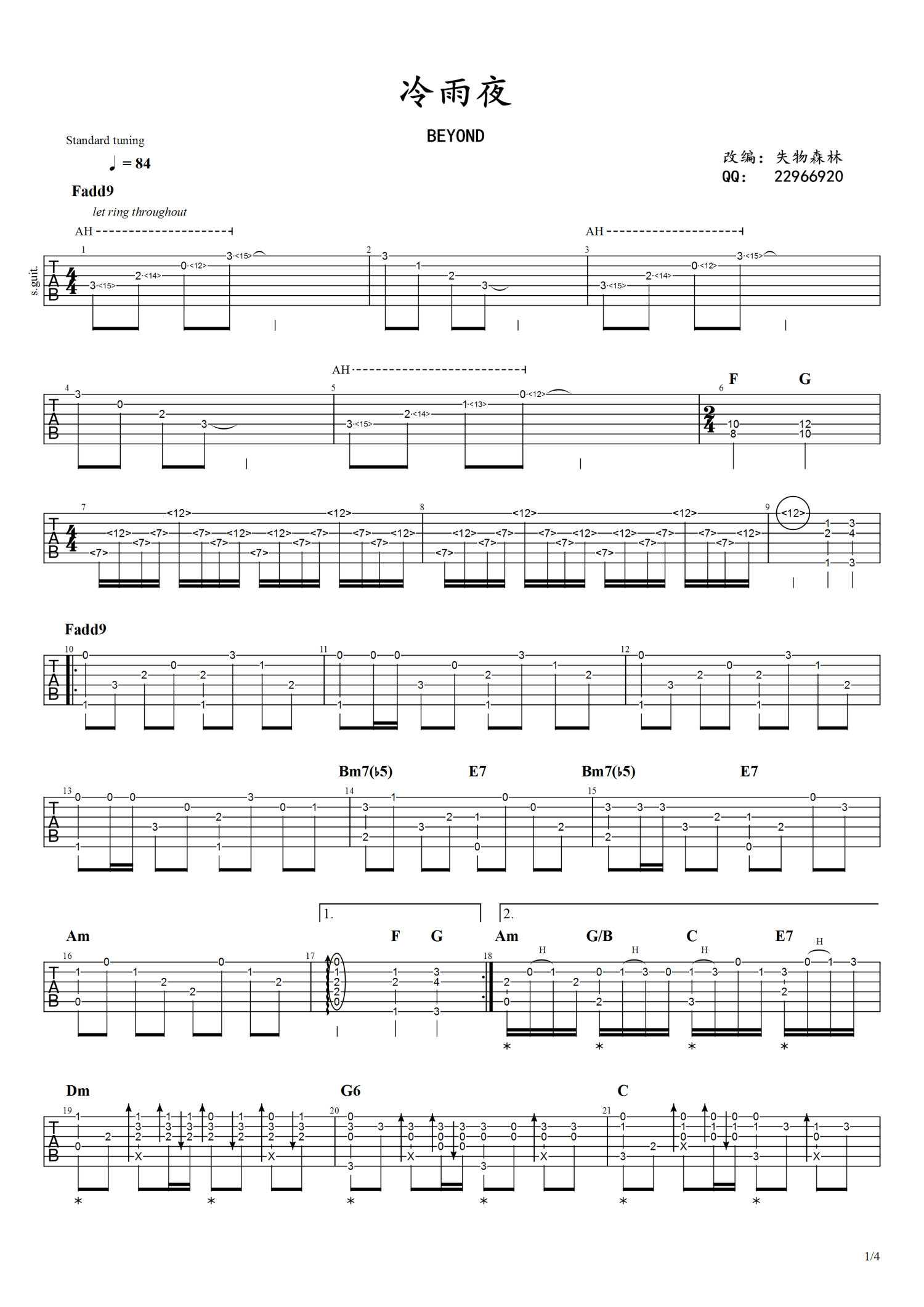 曲谱介绍: Beyond经典歌曲《冷雨夜》,优美的旋律满是忧伤和无奈,两个相恋的人,因为现实与理想的矛盾不得不忍痛分手。在雨中往日的一幕幕涌上心头,想要重拾温馨片段,但内心却明白此刻已经回不到过去。这首歌除了旋律之外,最经典还是中间的一段solo间奏,耐人寻味。吉他谱包含间奏的BassSolo,大家可以在视频里感受下。
