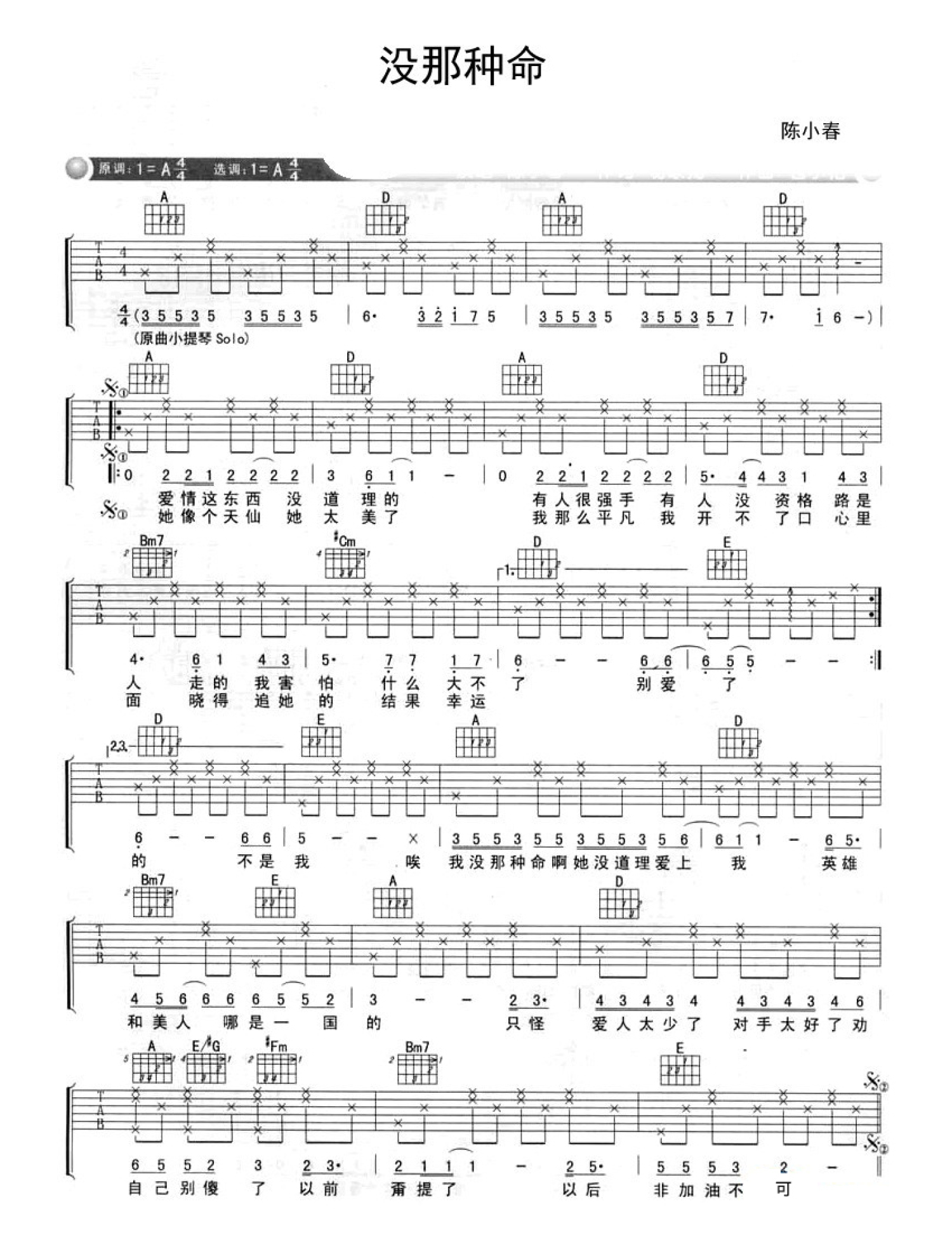 曲谱介绍: 陈小春《没那种命》吉他谱_A调吉他弹唱谱
