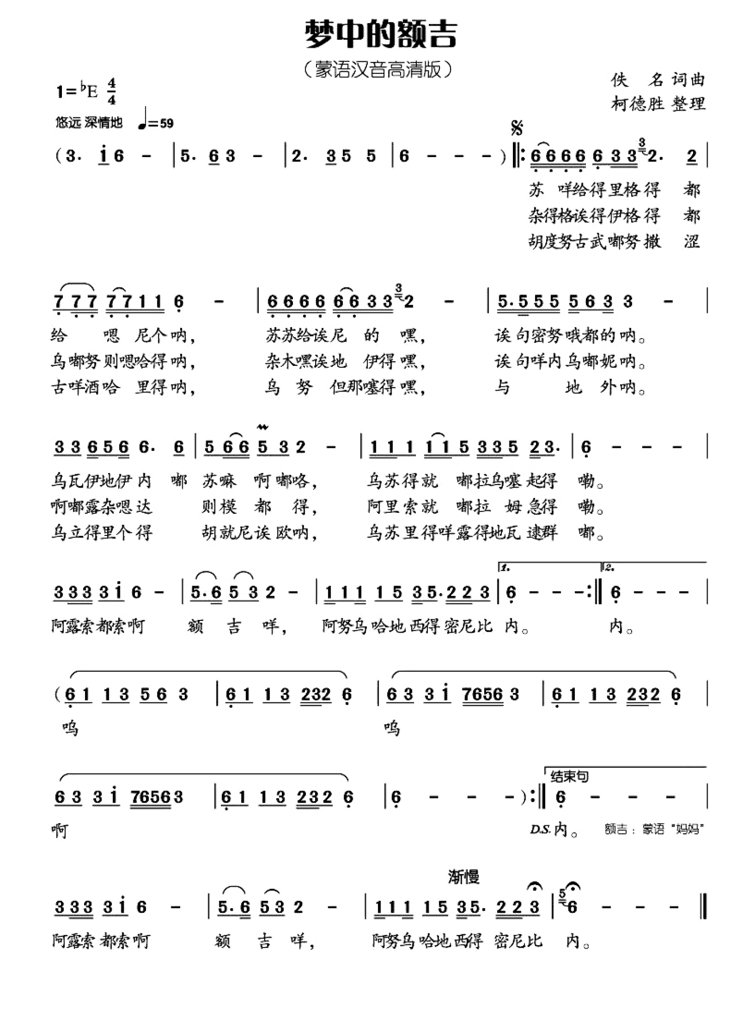 曲谱介绍: 乌达木《梦中的额吉》歌词_简谱