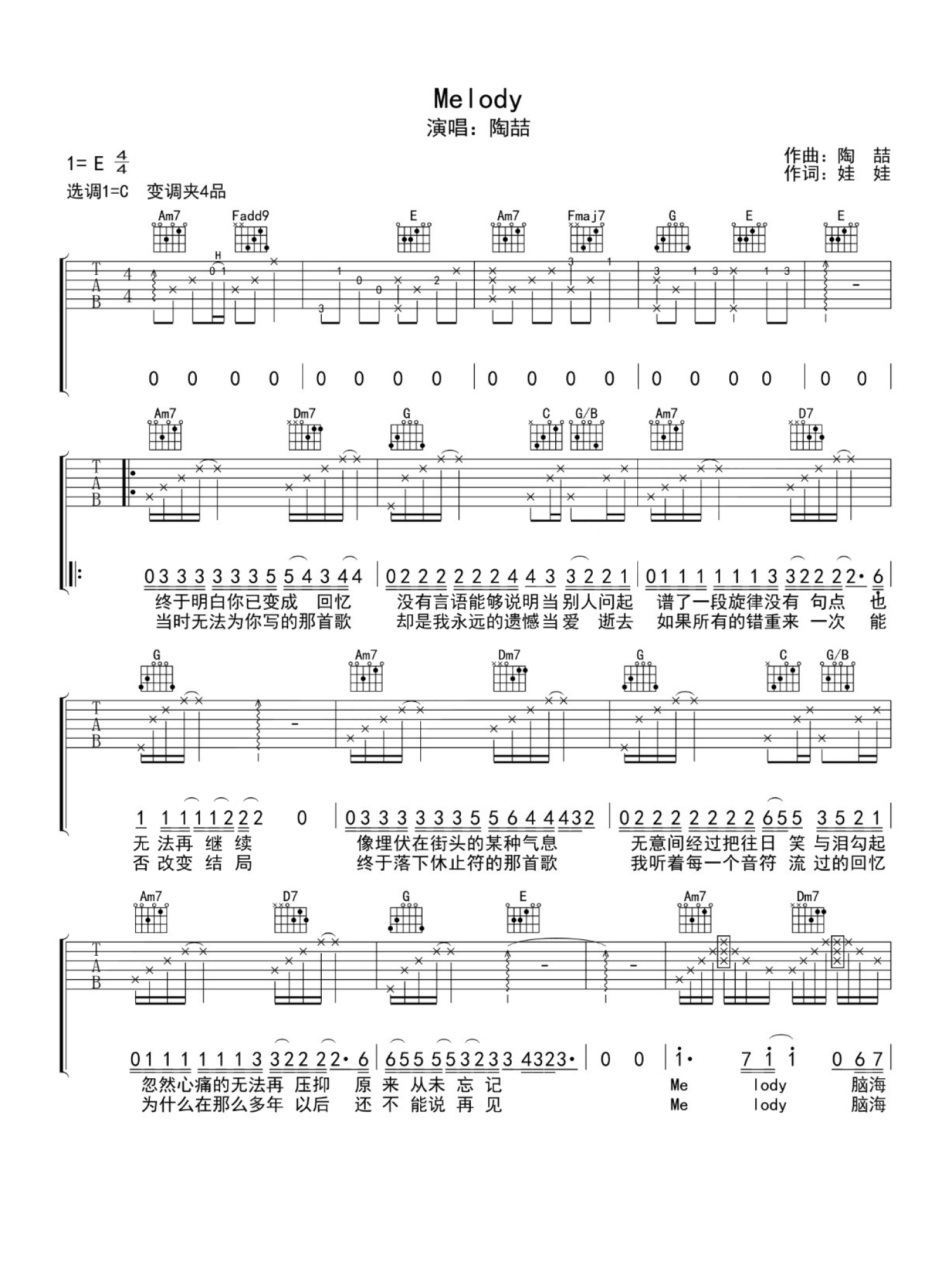 melody吉他谱 - 陶喆 - C调吉他弹唱谱