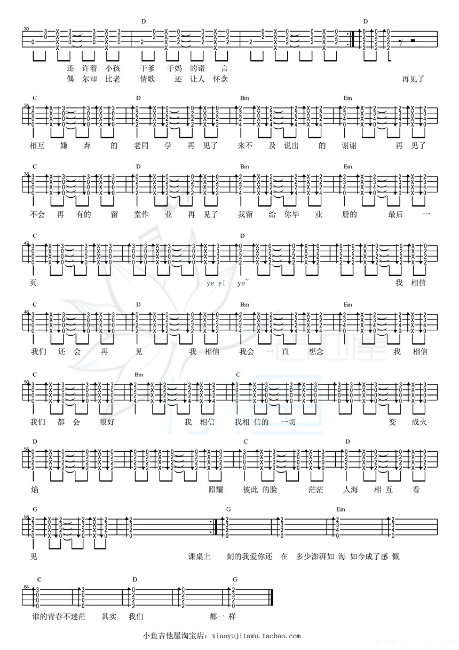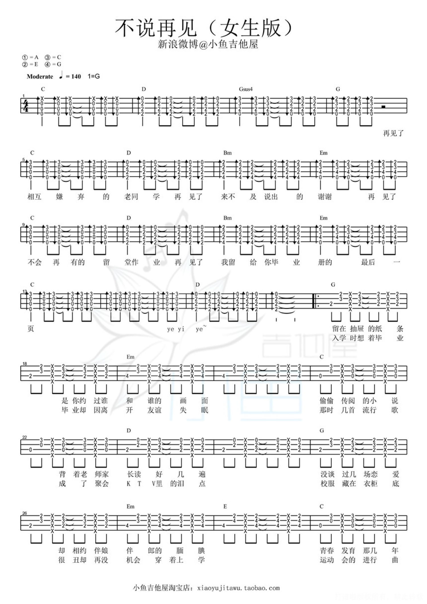 曲谱介绍: 好妹妹乐队《不说再见》_G调尤克里里谱_女生版