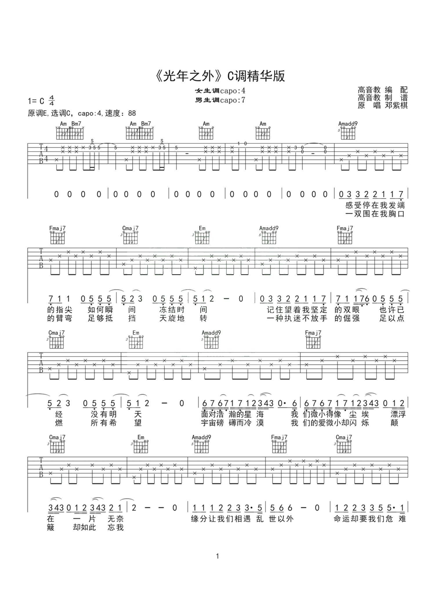 光年之外吉他谱 - 邓紫棋 - C调吉他弹唱谱 - 女生版
