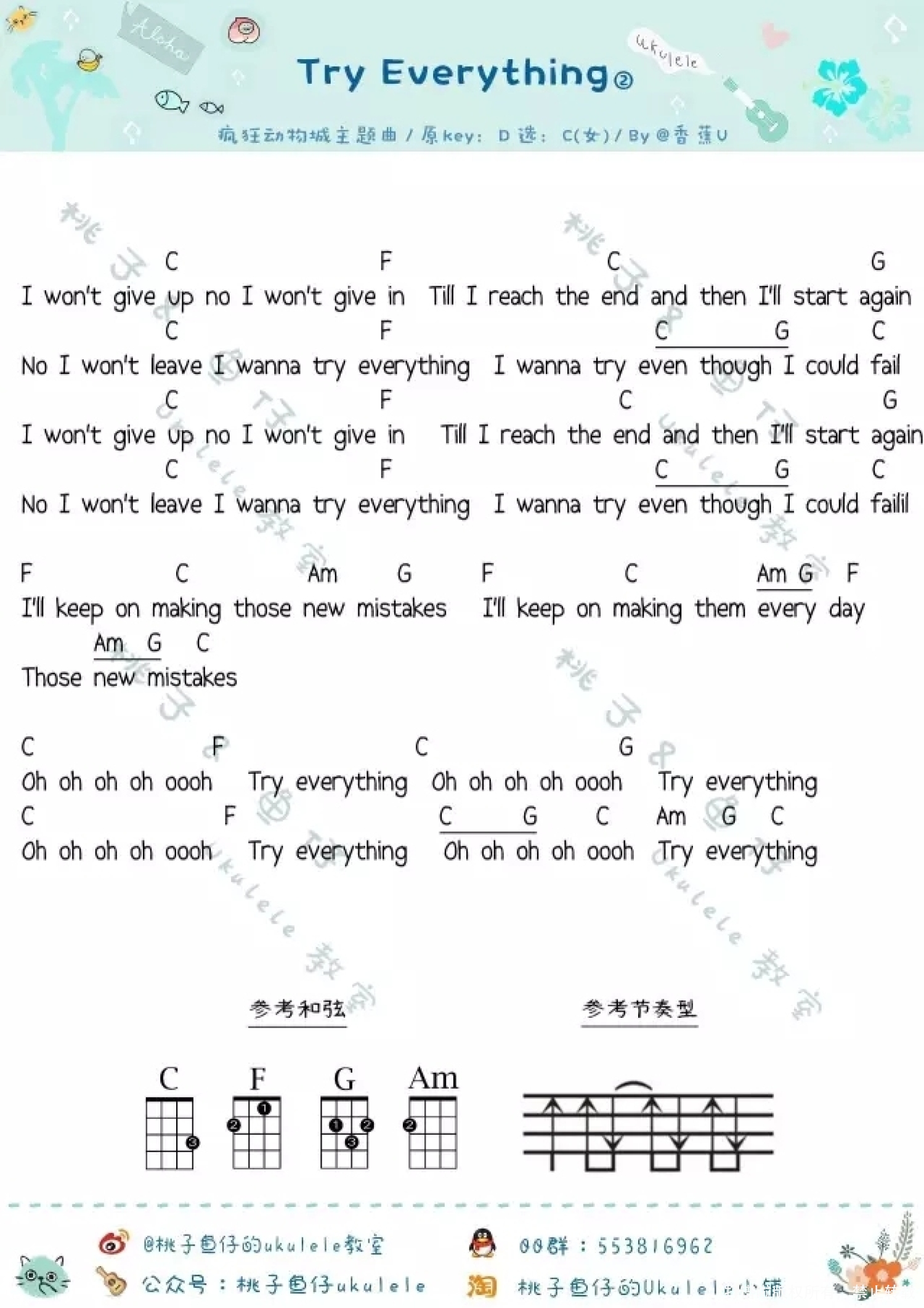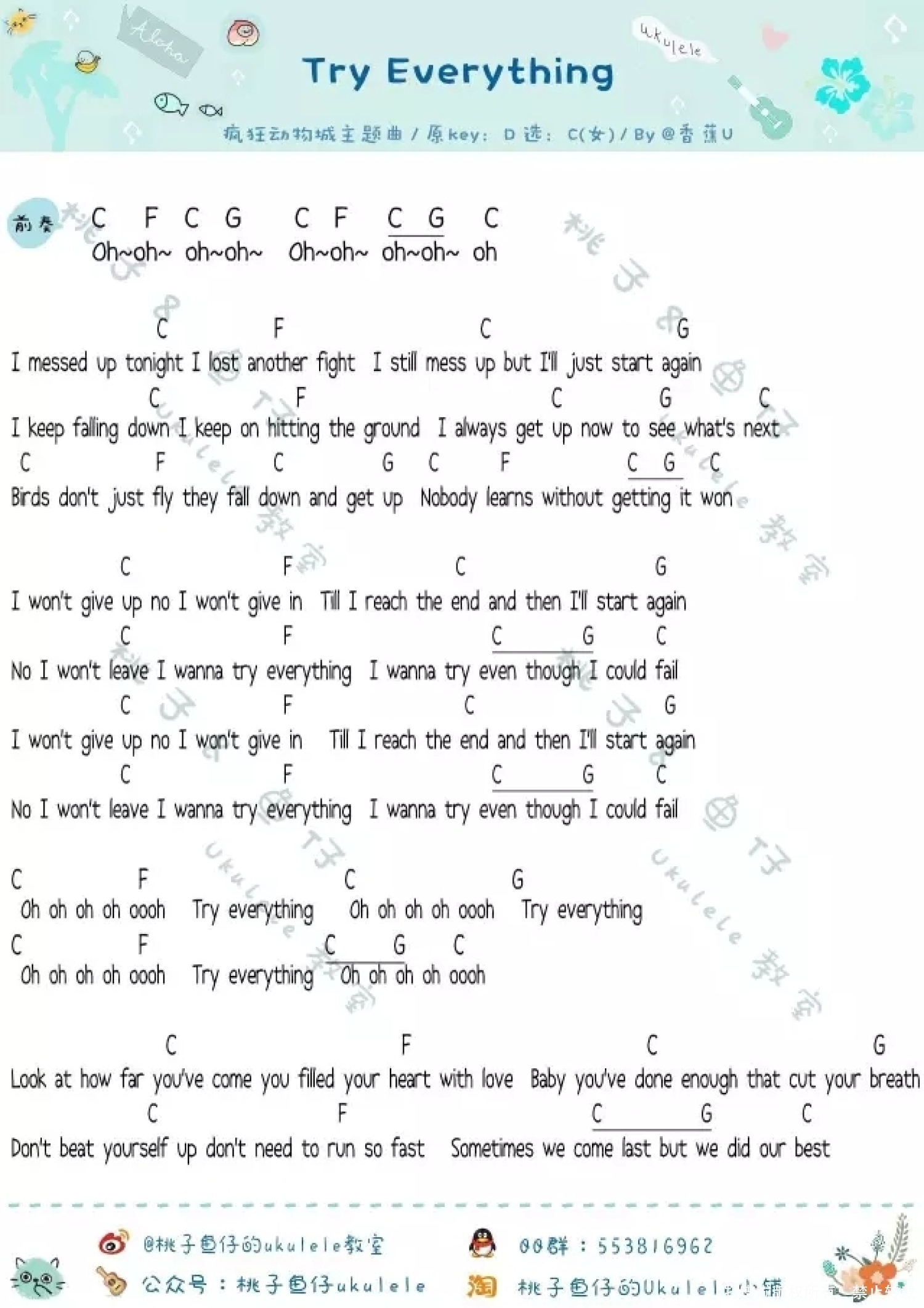 曲谱介绍: 疯狂动物城主题曲《Try Everything》_C调尤克里里谱_女生版