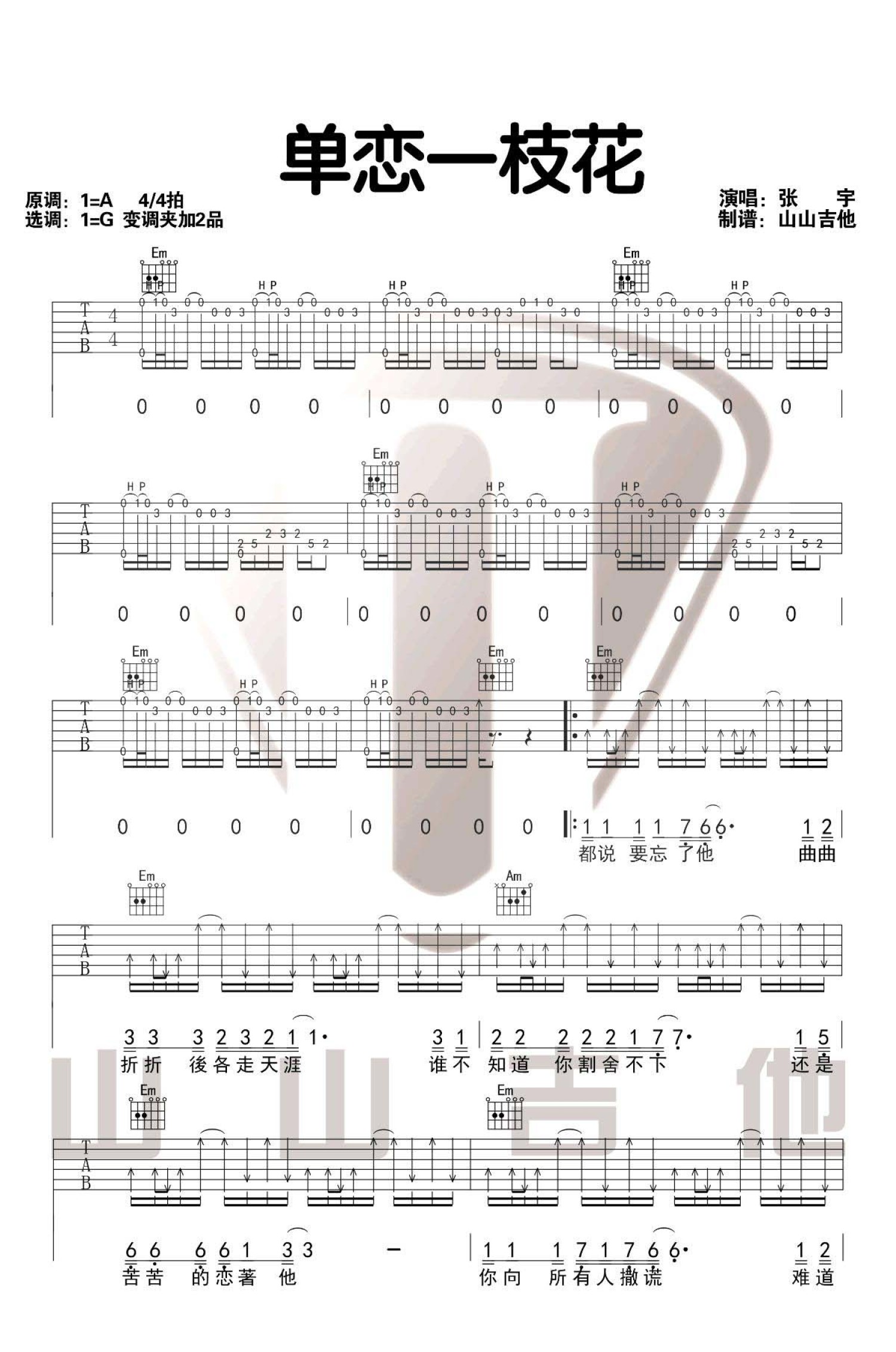 曲谱介绍: 张宇《单恋一枝花》吉他谱_G调吉他弹唱谱