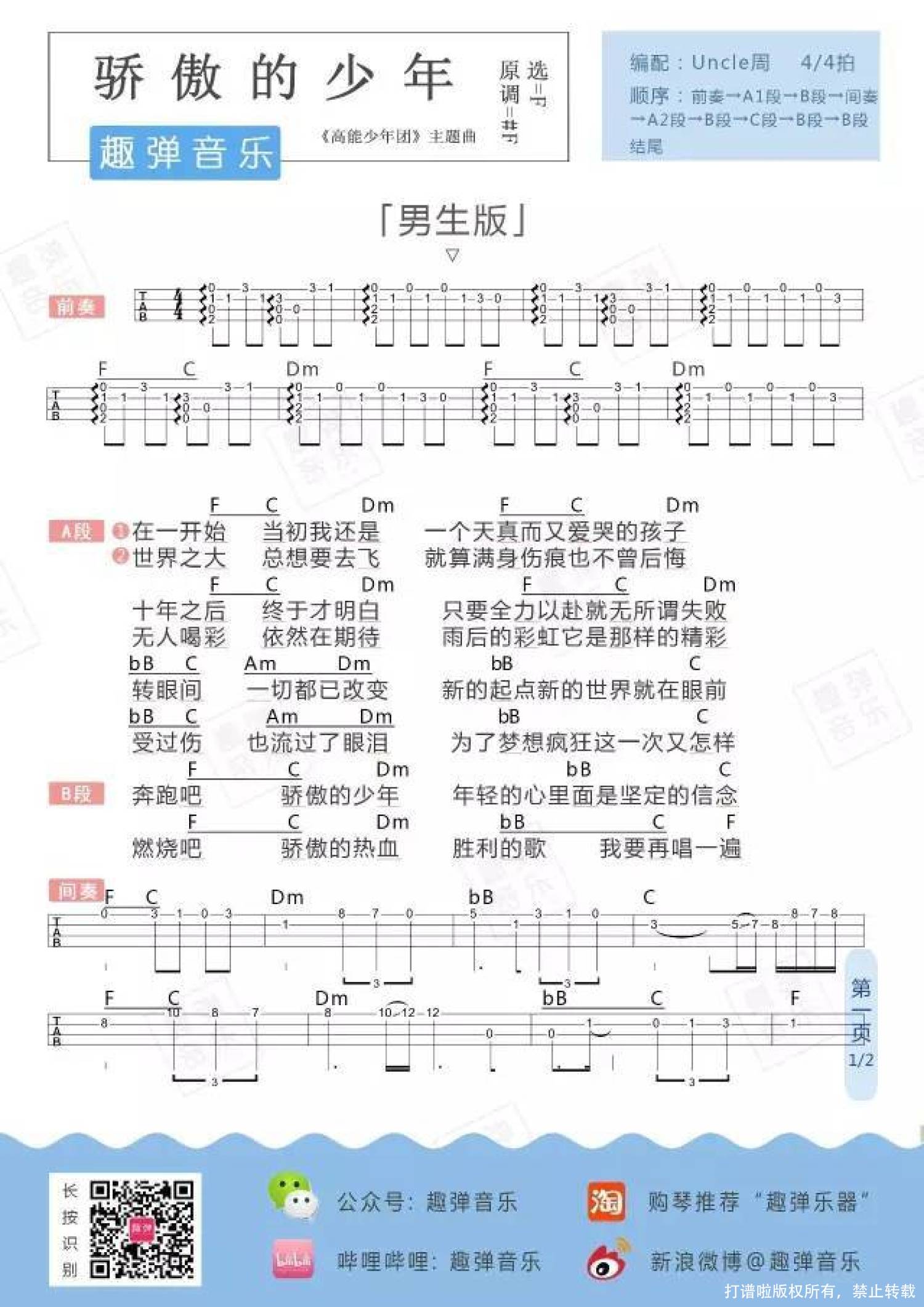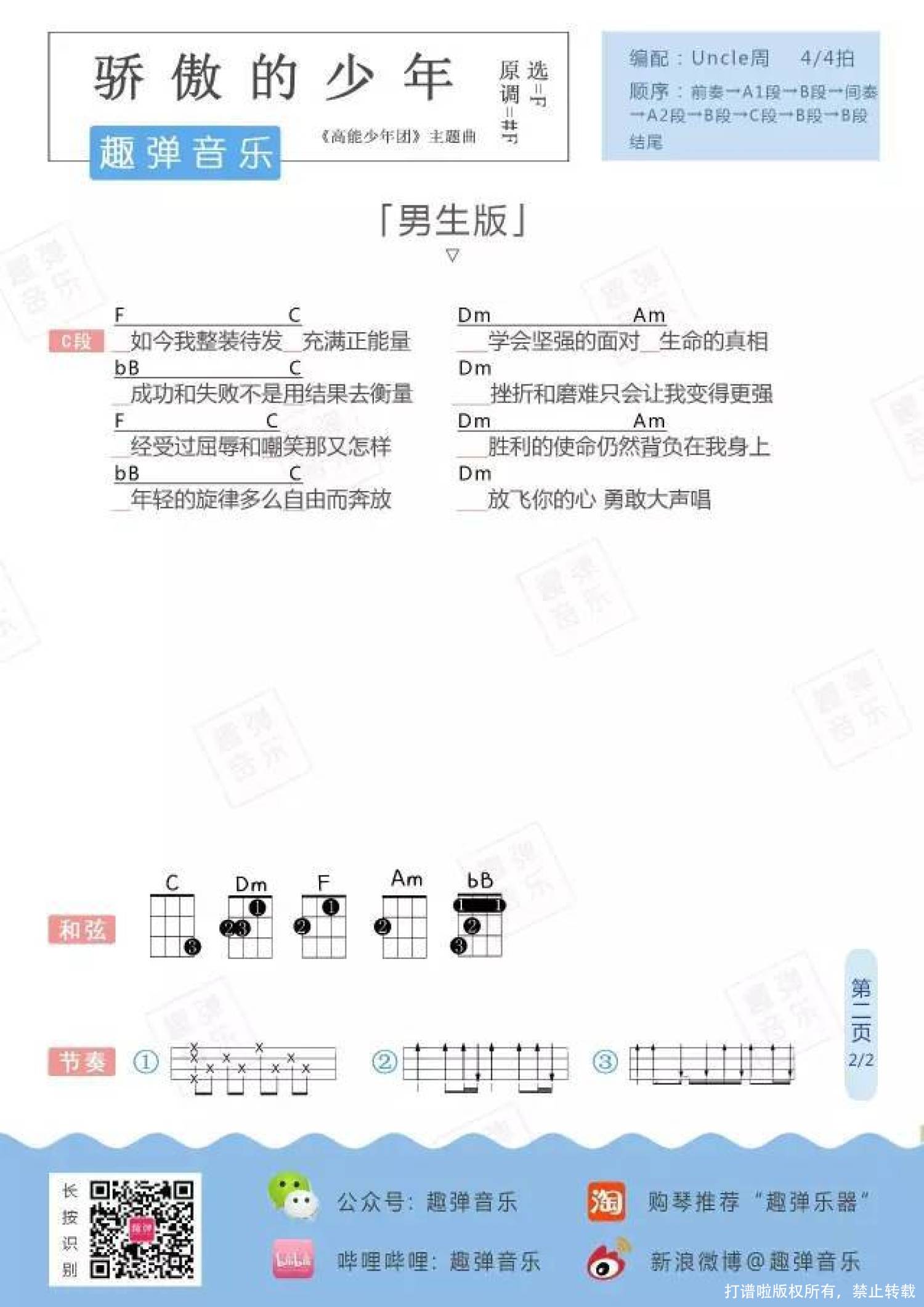 曲谱介绍: 南征北战《骄傲的少年》_F调尤克里里谱_男生版
