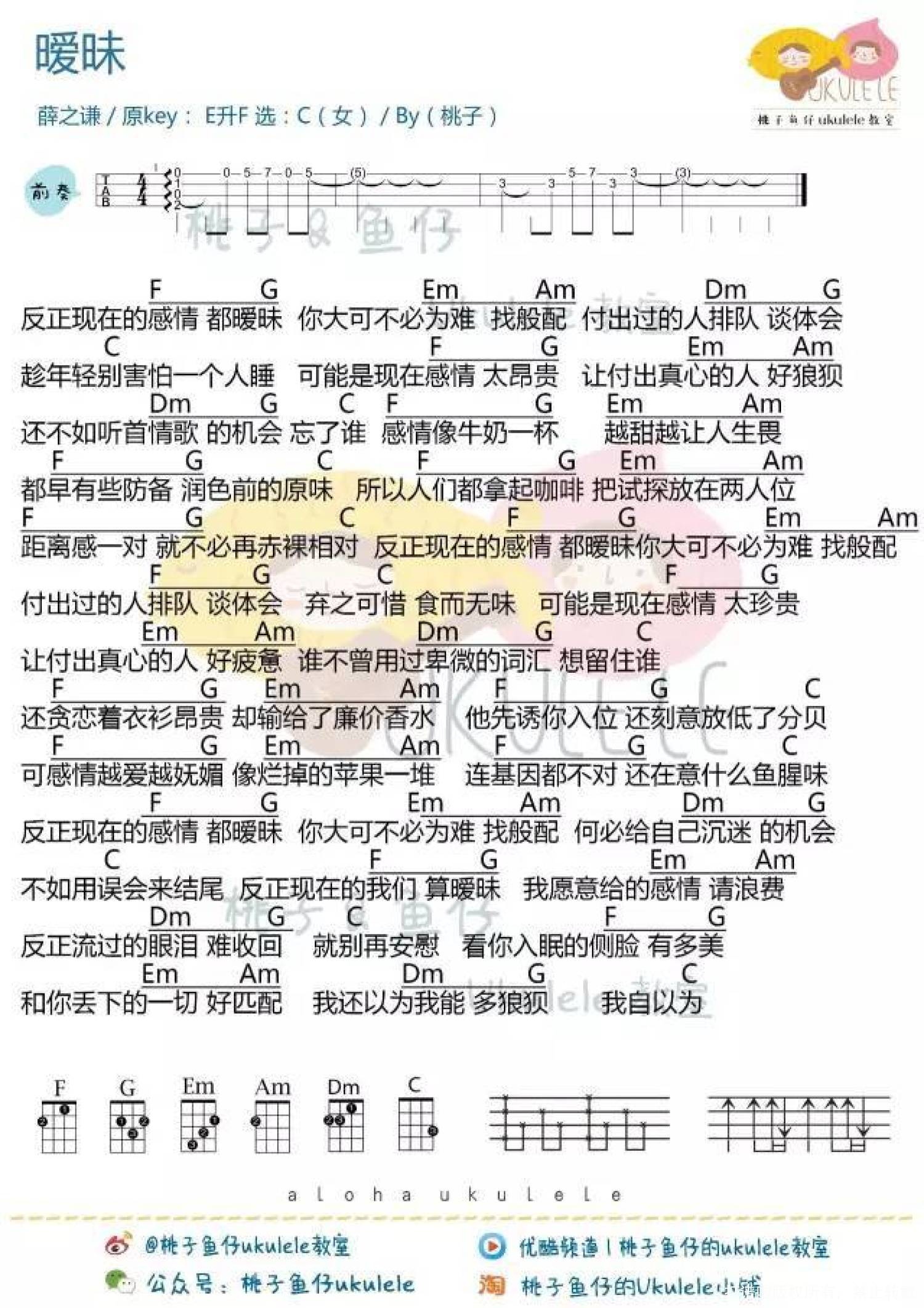 曲谱介绍: 薛之谦《暧昧》_C调尤克里里谱_女生版