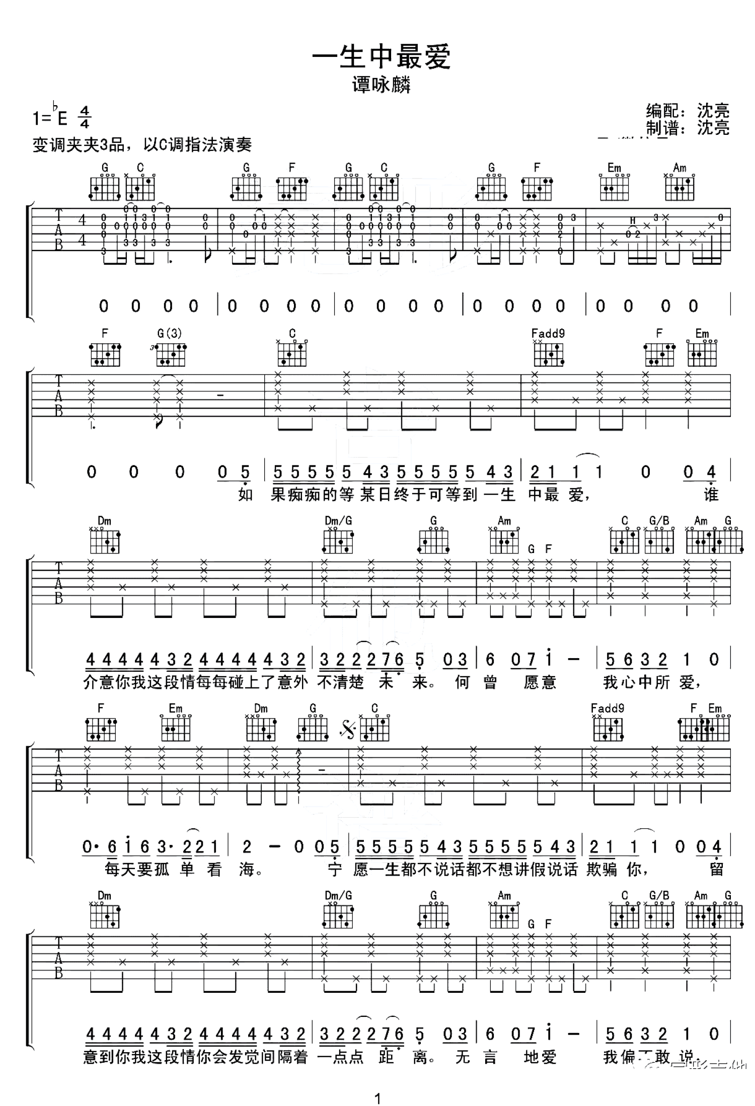 一生中最爱吉他谱 - 谭咏麟/陈奕迅 - C调吉他弹唱谱