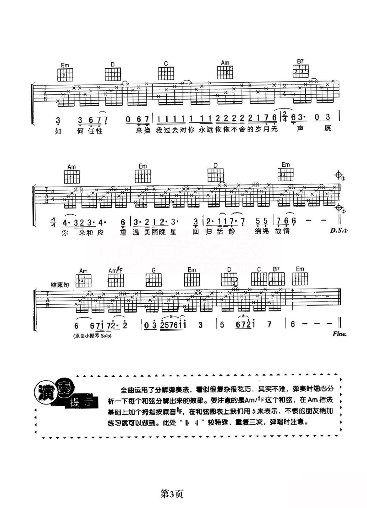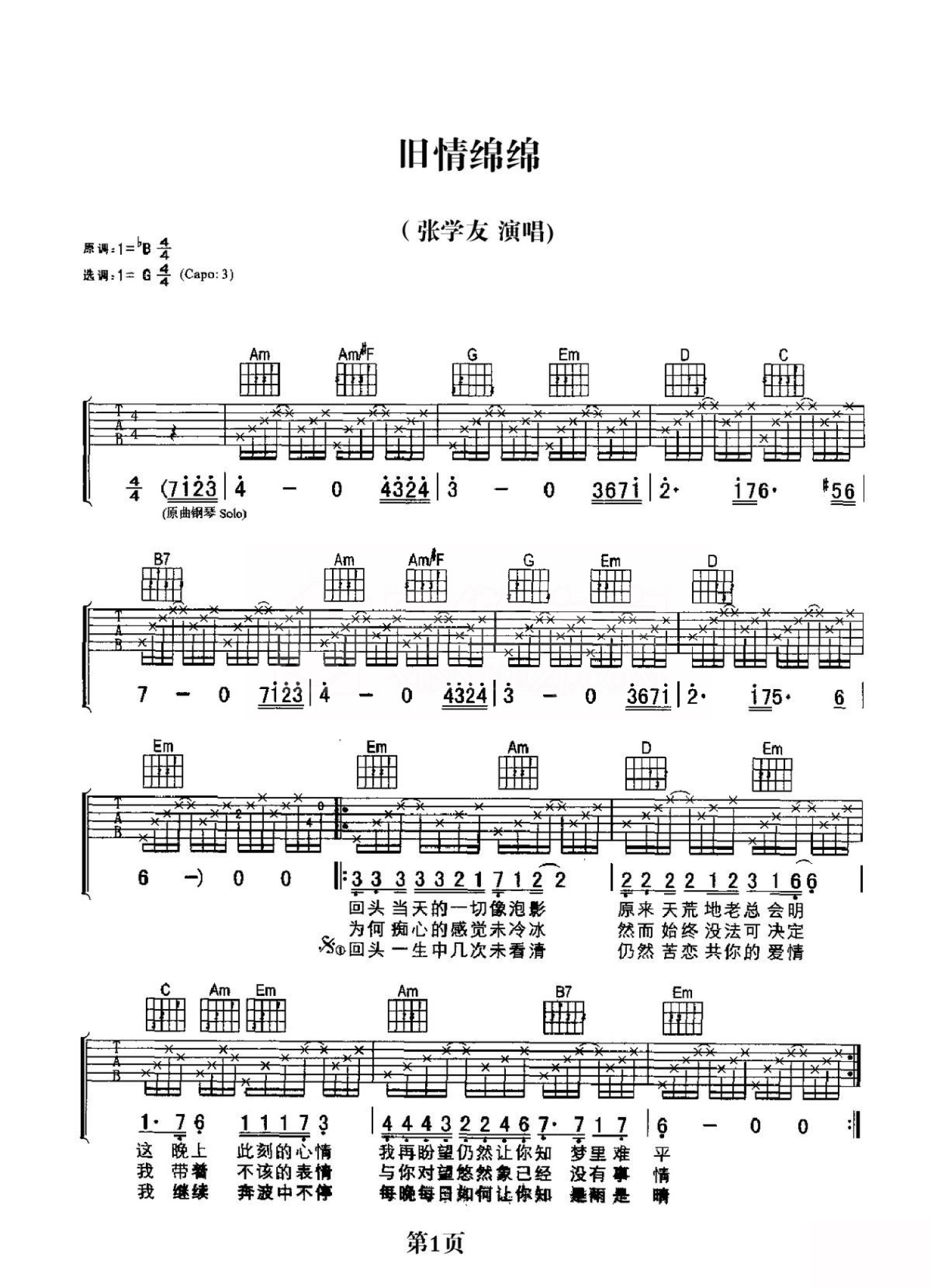 曲谱介绍: G调版 张学友《旧情绵绵》吉他弹唱六线谱