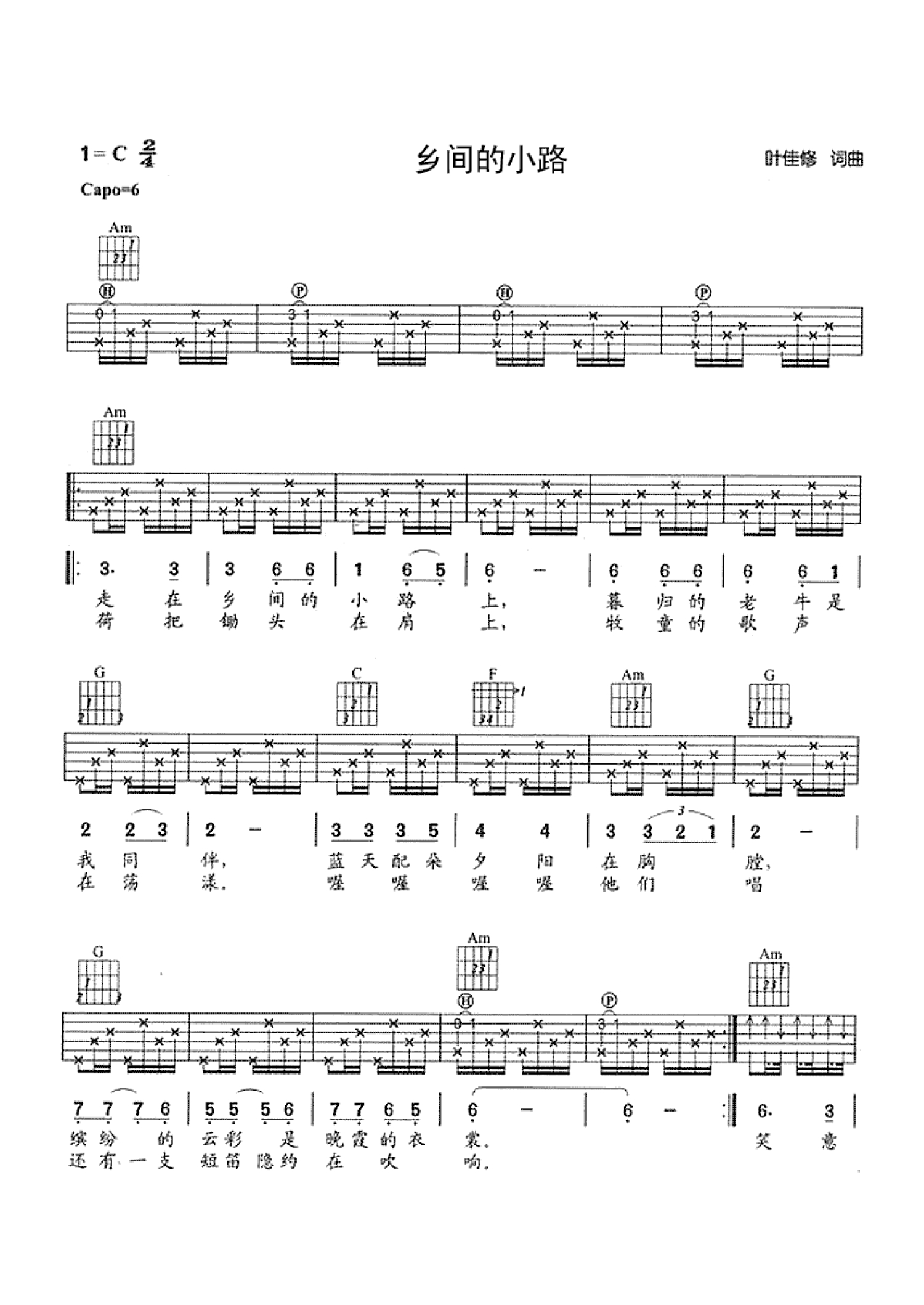 曲谱介绍: 走在乡间的小路上吉他谱_六线谱_齐豫高清版C调弹唱谱《乡间的小路》又叫做《乡间的小路上》《走在乡间的小路上》,是台湾著名音乐人叶佳修的代表词曲作品之一。
