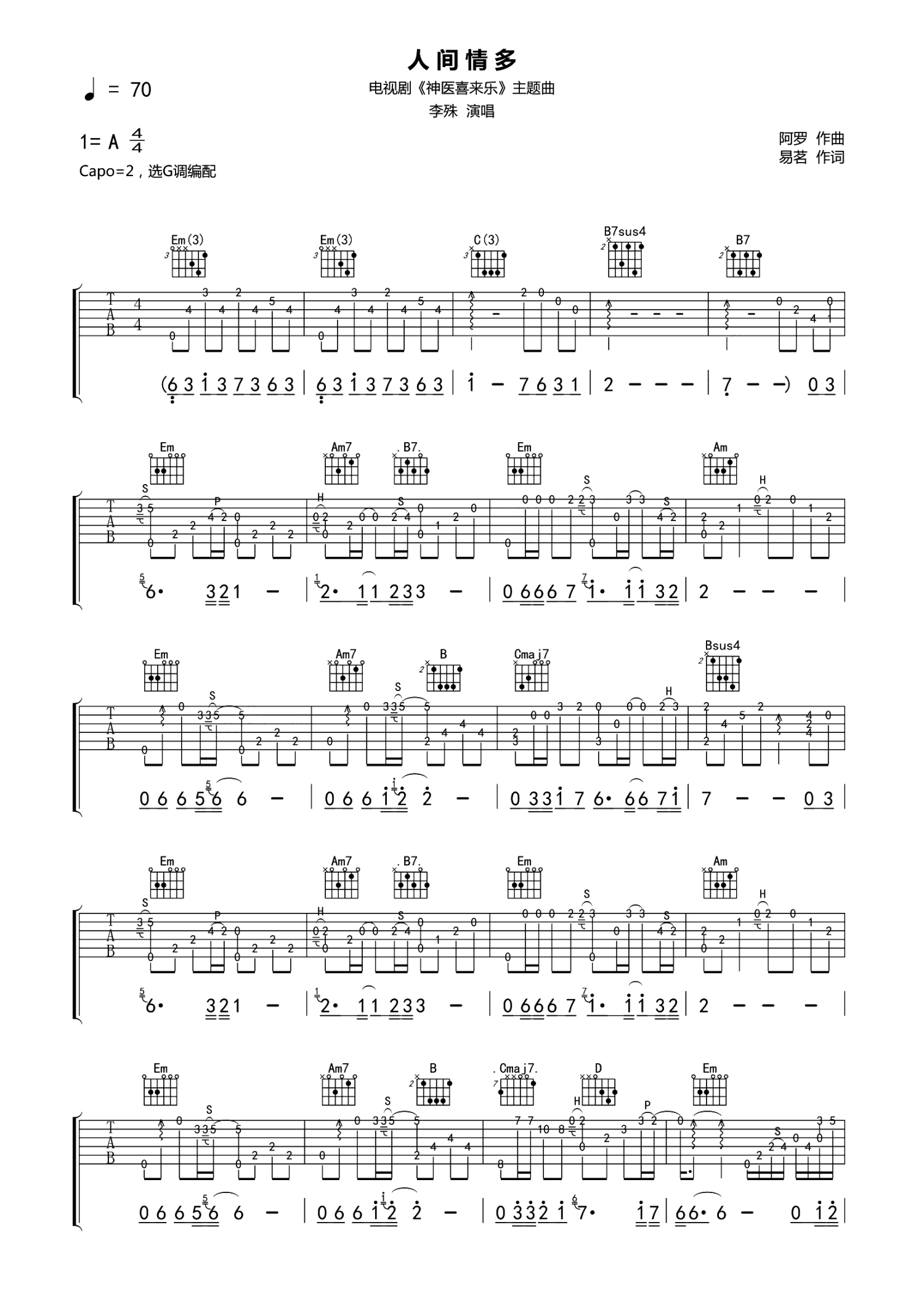 人间情多吉他谱 - 李殊 - G调吉他独奏谱
