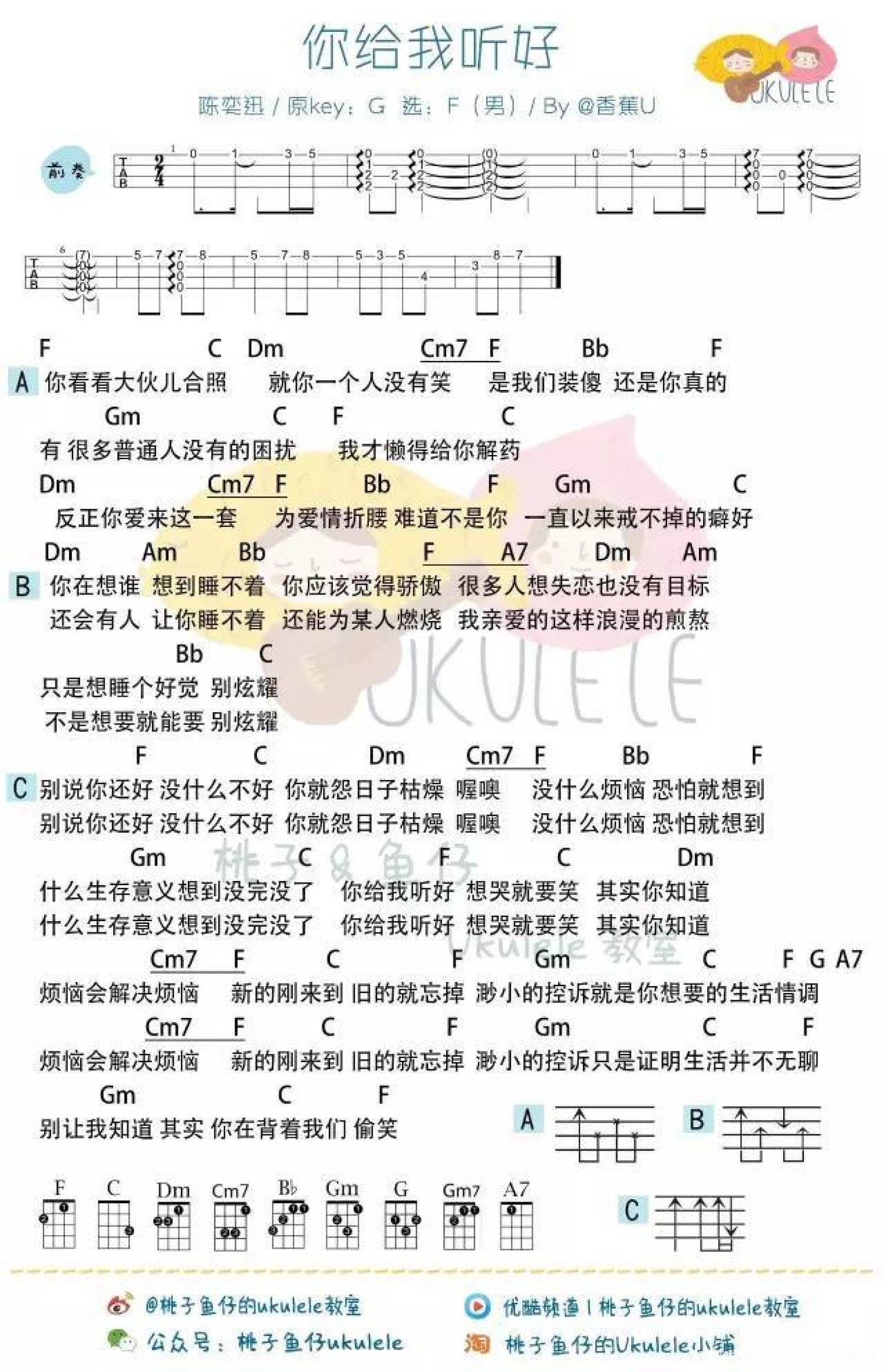 曲谱介绍: 陈奕迅《你给我听好》_F调尤克里里谱_男生版