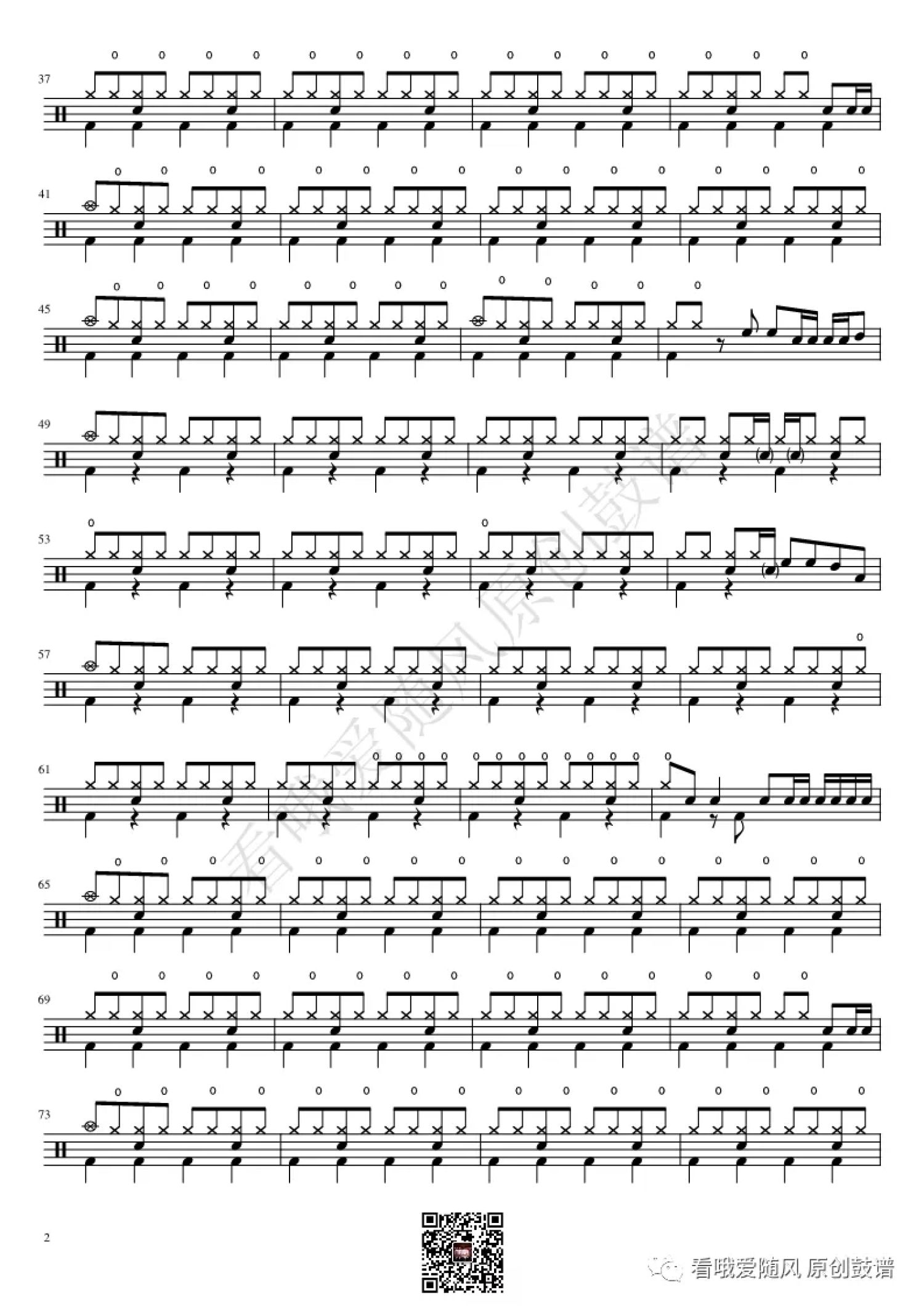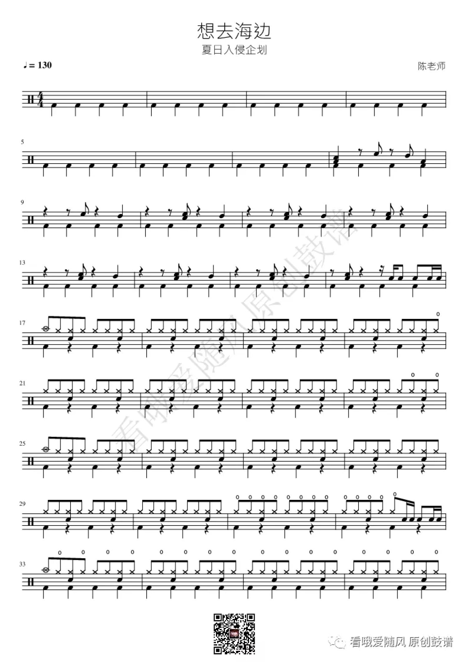 曲谱介绍: 夏日入侵计划《想去海边》鼓谱_架子鼓谱,本谱来自 @看哦爱随风原创鼓谱 编配, 扒谱服务 请联系 看哦爱随风原创鼓谱  微信:Cthcyb