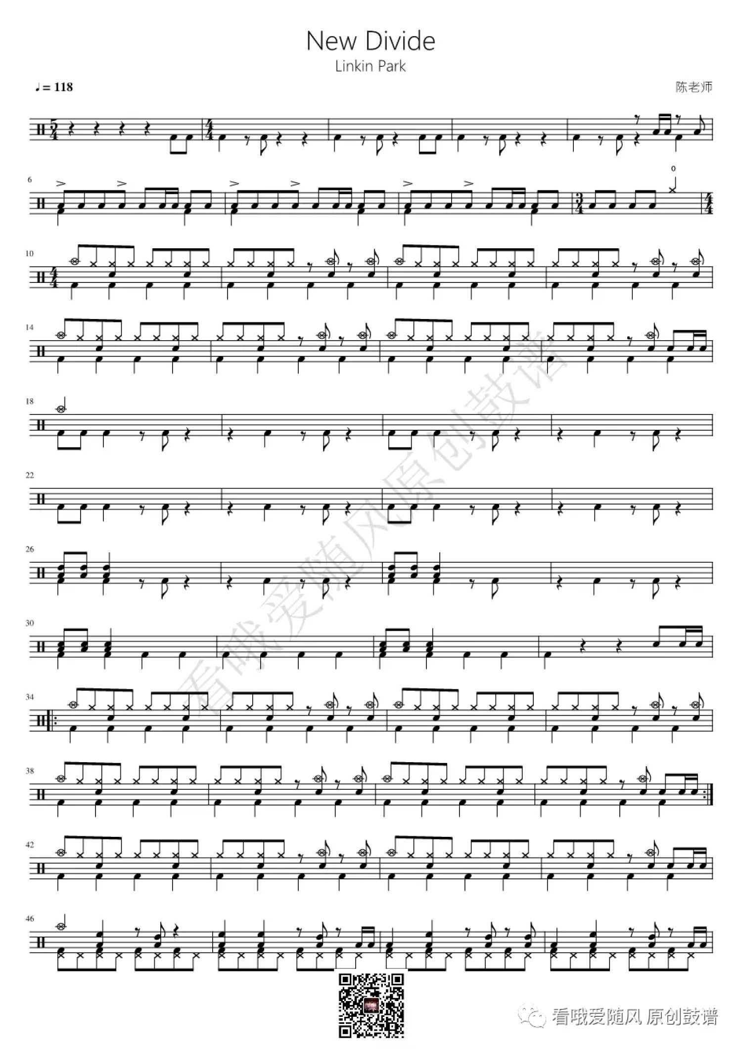 曲谱介绍: 林肯公园《new divide》鼓谱_架子鼓谱,本谱来自 @看哦爱随风原创鼓谱 编配。共2页
