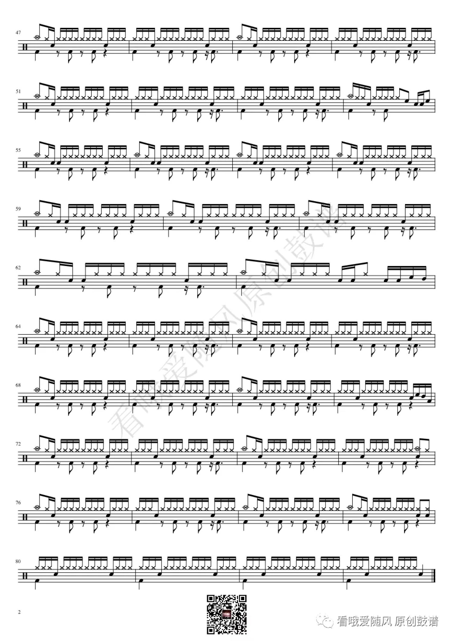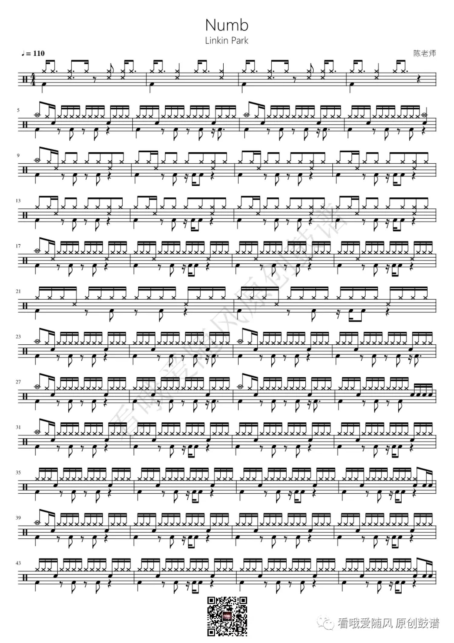 曲谱介绍: 林肯公园《Numb》鼓谱_架子鼓谱,本谱来自 @看哦爱随风原创鼓谱 编配,共2页。