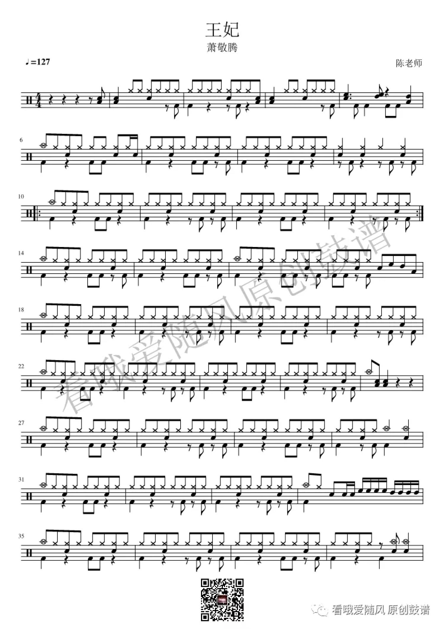 曲谱介绍: 萧敬腾《王妃》鼓谱_架子鼓谱,本谱来自 @看哦爱随风原创鼓谱 编配, 扒谱服务 请联系 看哦爱随风原创鼓谱  微信:Cthcyb