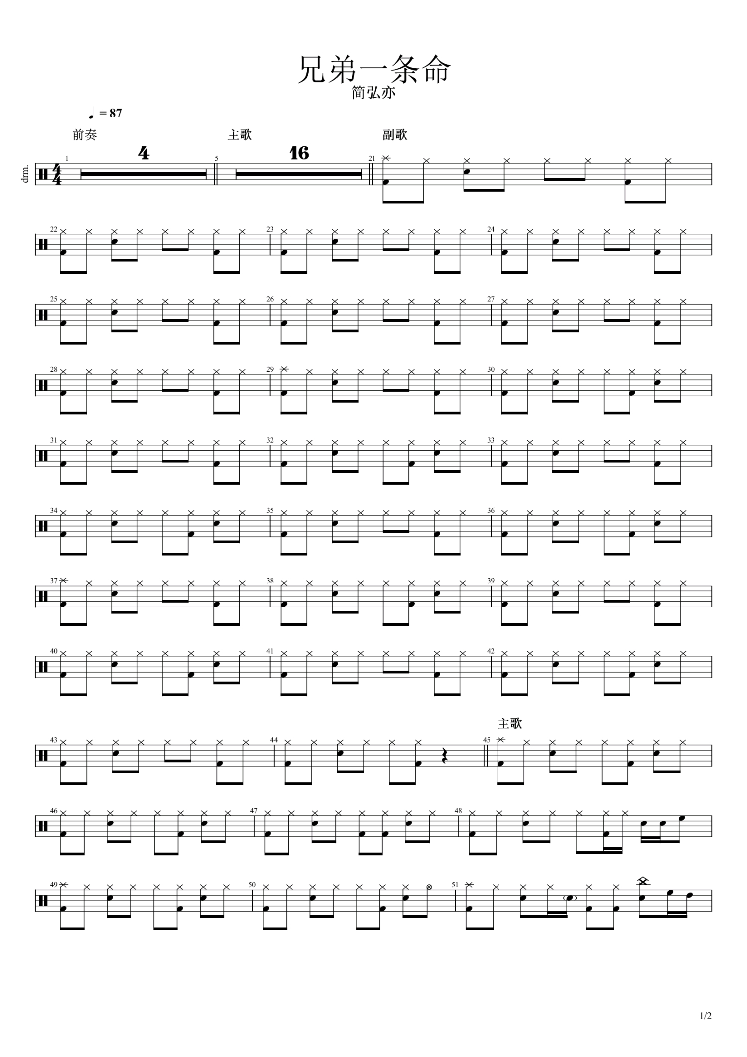 兄弟一条命鼓谱 - 简弘亦 - 架子鼓谱