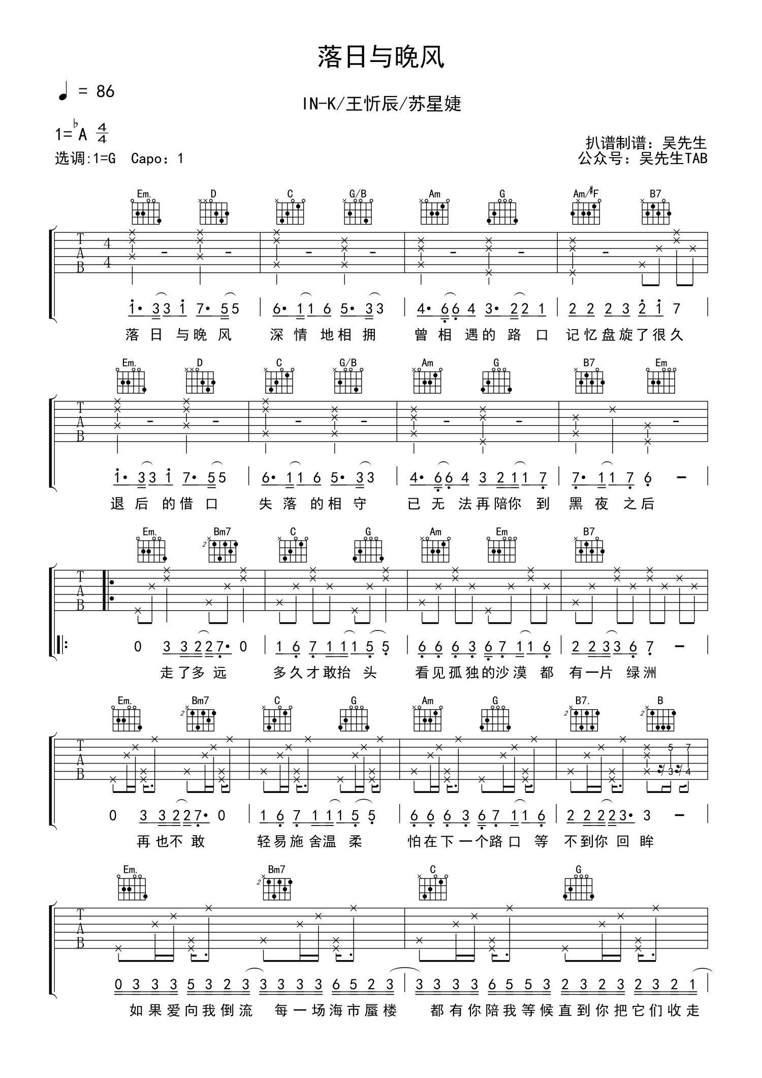 • 落日与晚风吉他谱 - IN-K/王忻辰/苏星婕 - G调吉他弹唱谱第1张