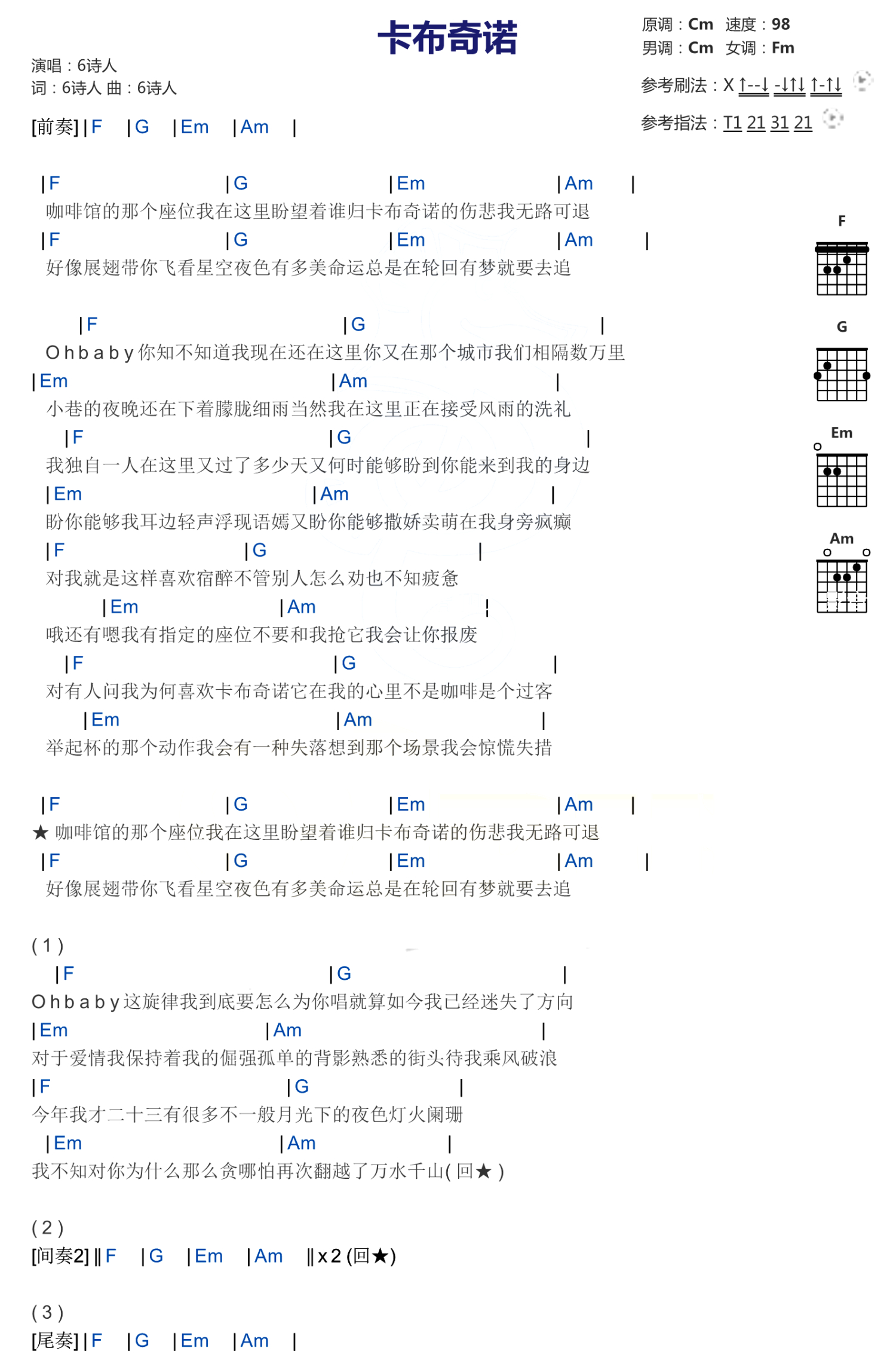 卡布奇诺吉他谱 - 6诗人 - F调吉他弹唱谱