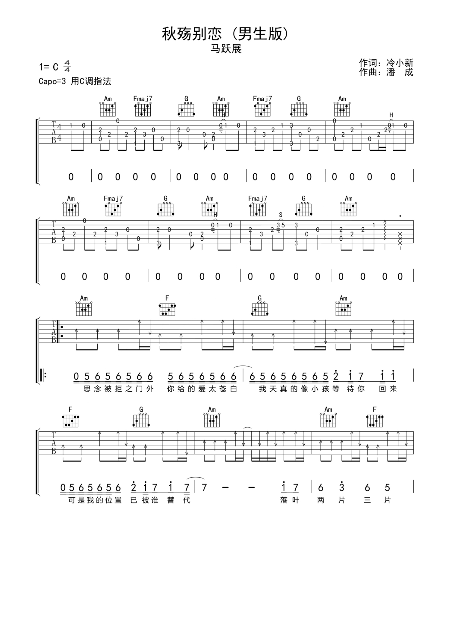 曲谱介绍: 马跃展《秋殇别离》吉他谱_C调吉他弹唱谱