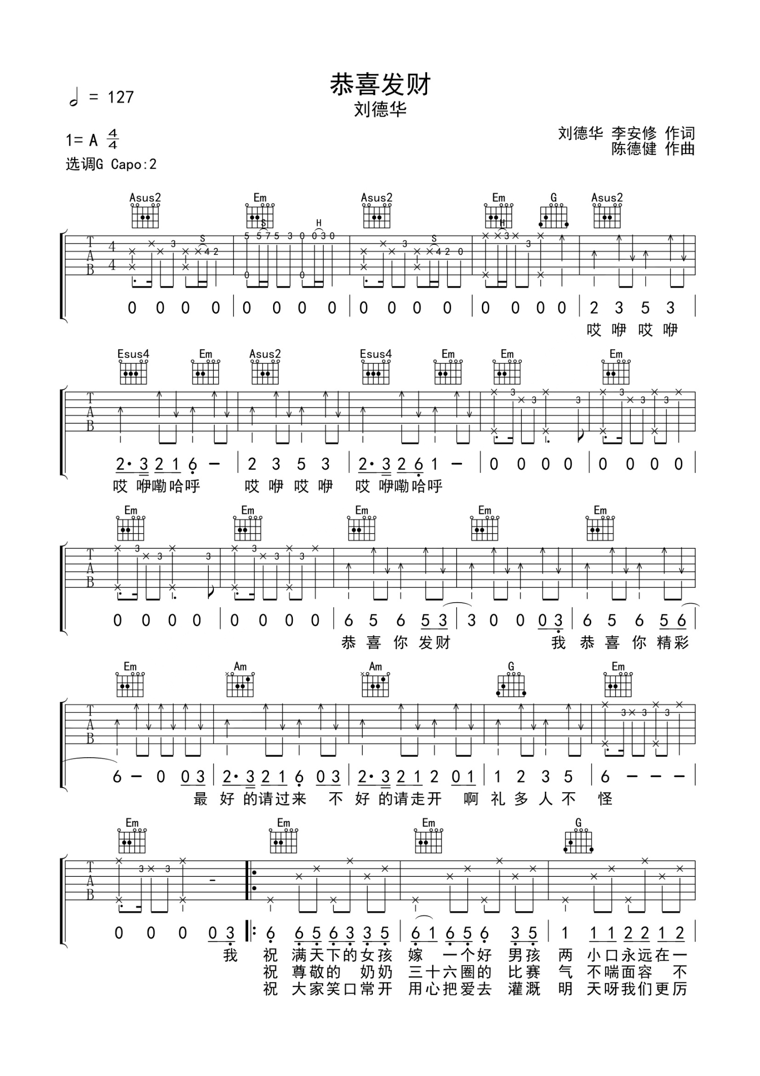 曲谱介绍: 刘德华《恭喜发财》吉他谱_G调吉他弹唱谱