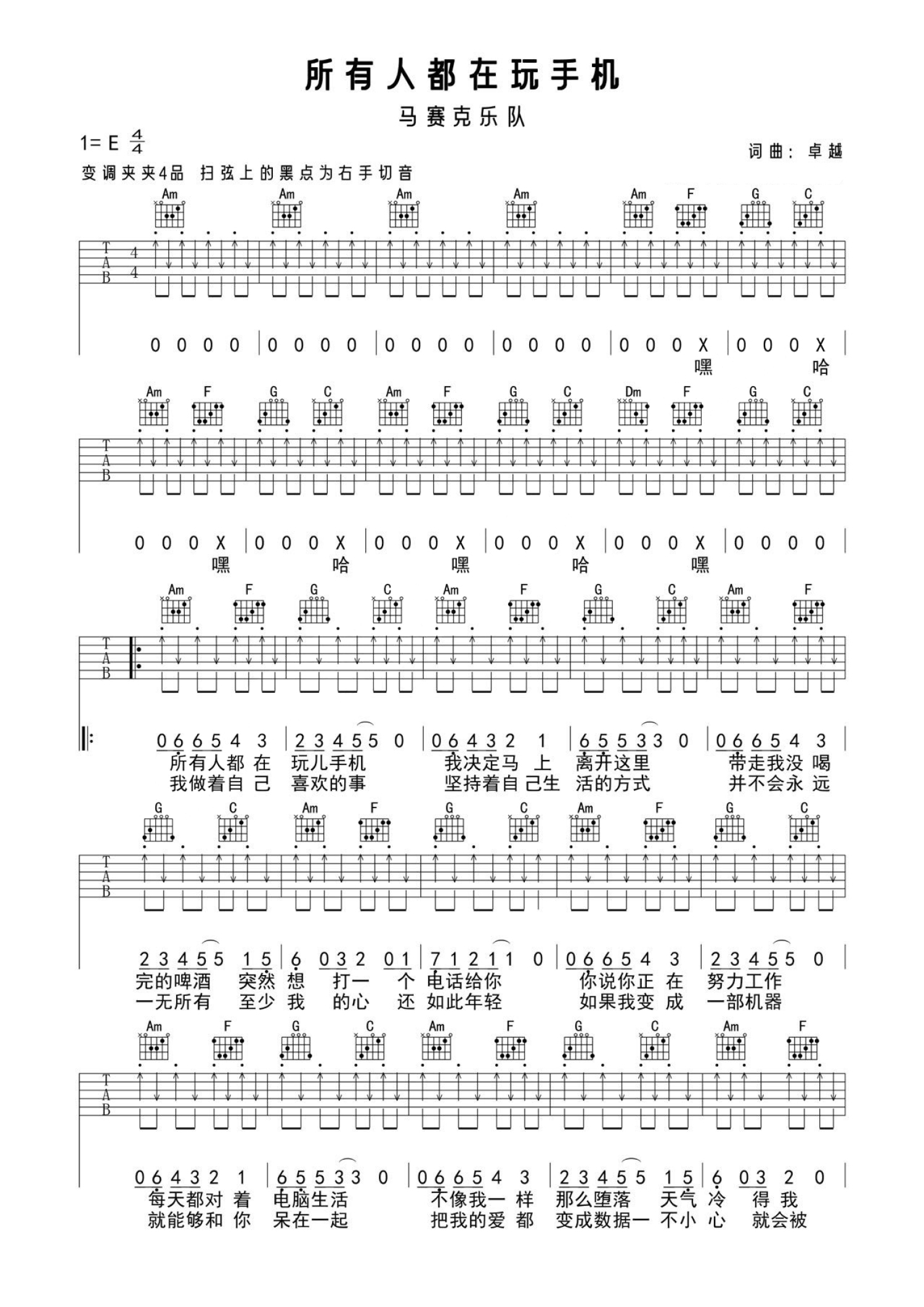 曲谱介绍: 马赛克《所有人都在玩手机》吉他谱_C调吉他弹唱谱