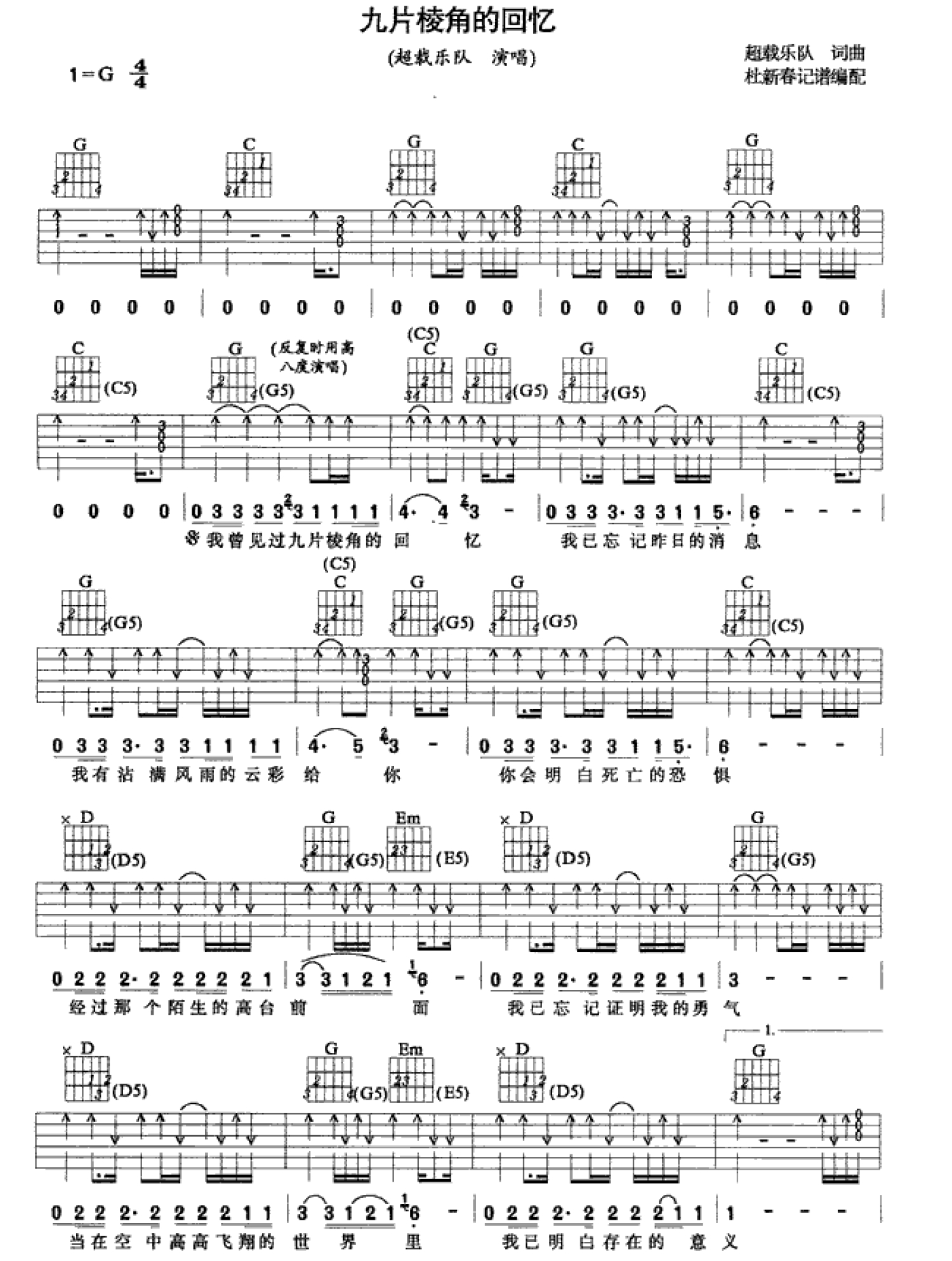 曲谱介绍: 超载乐队《九片棱角的回忆》吉他谱_G调吉他弹唱谱