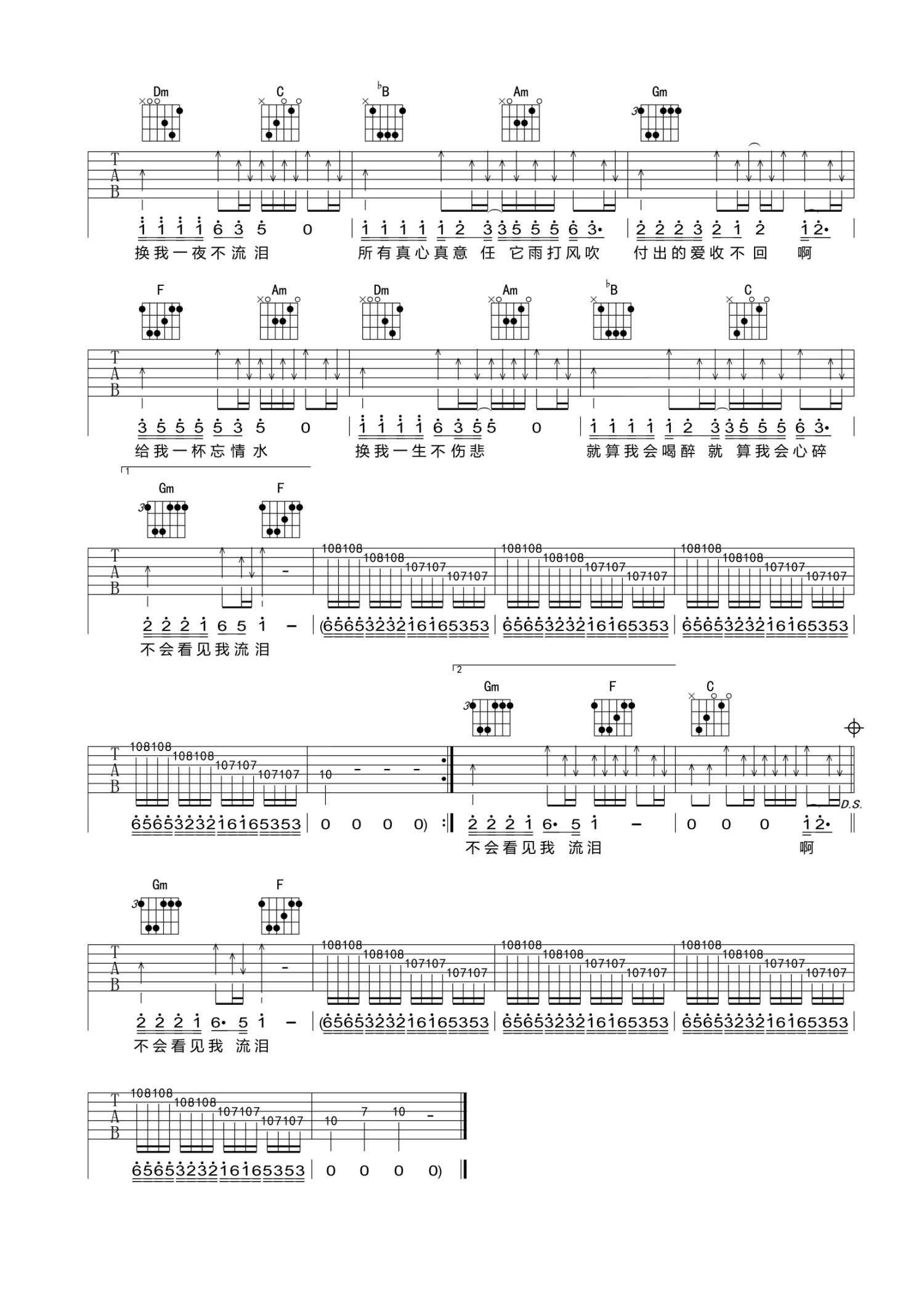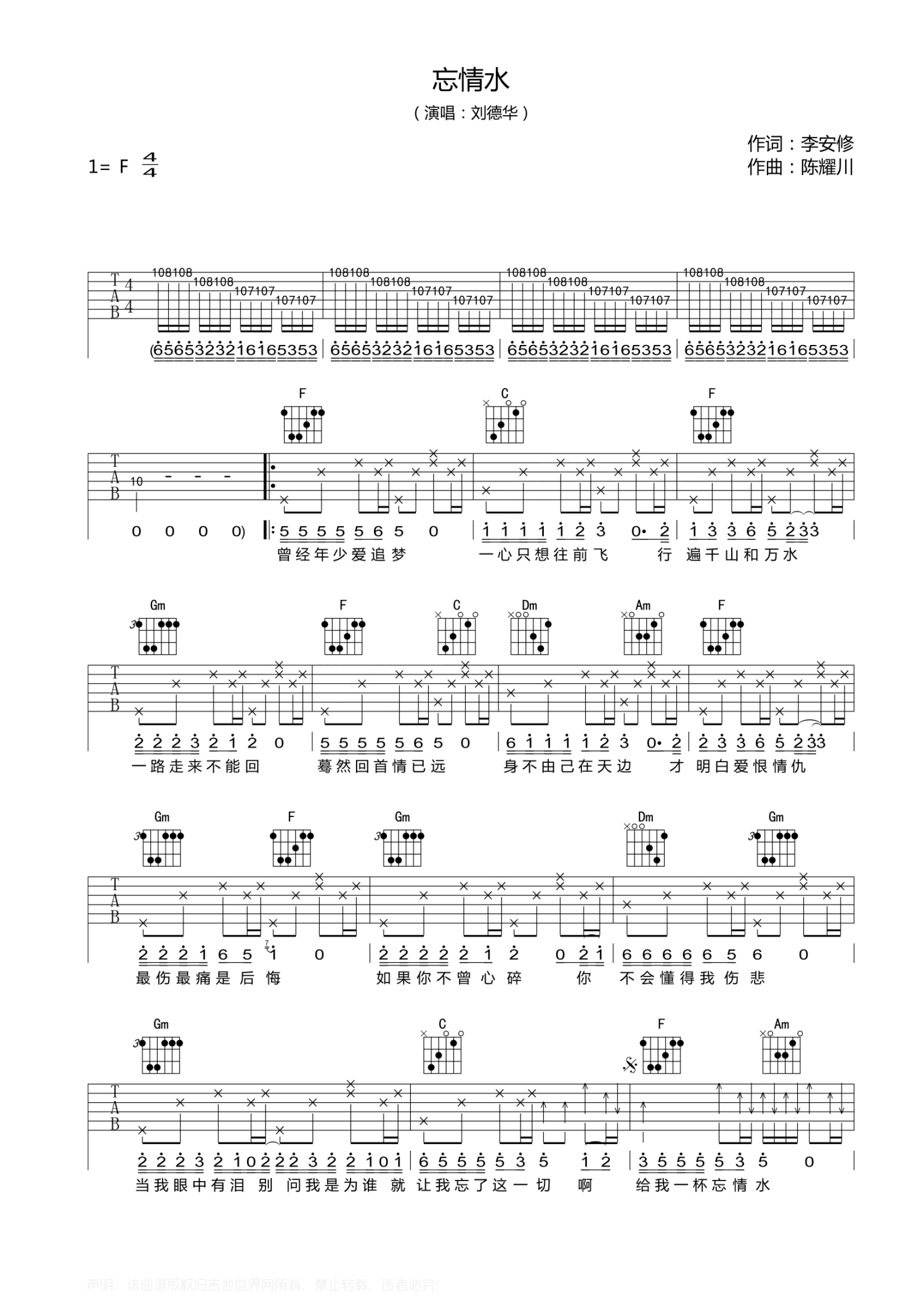 曲谱介绍: 刘德华《忘情水》吉他谱_F调吉他弹唱谱
