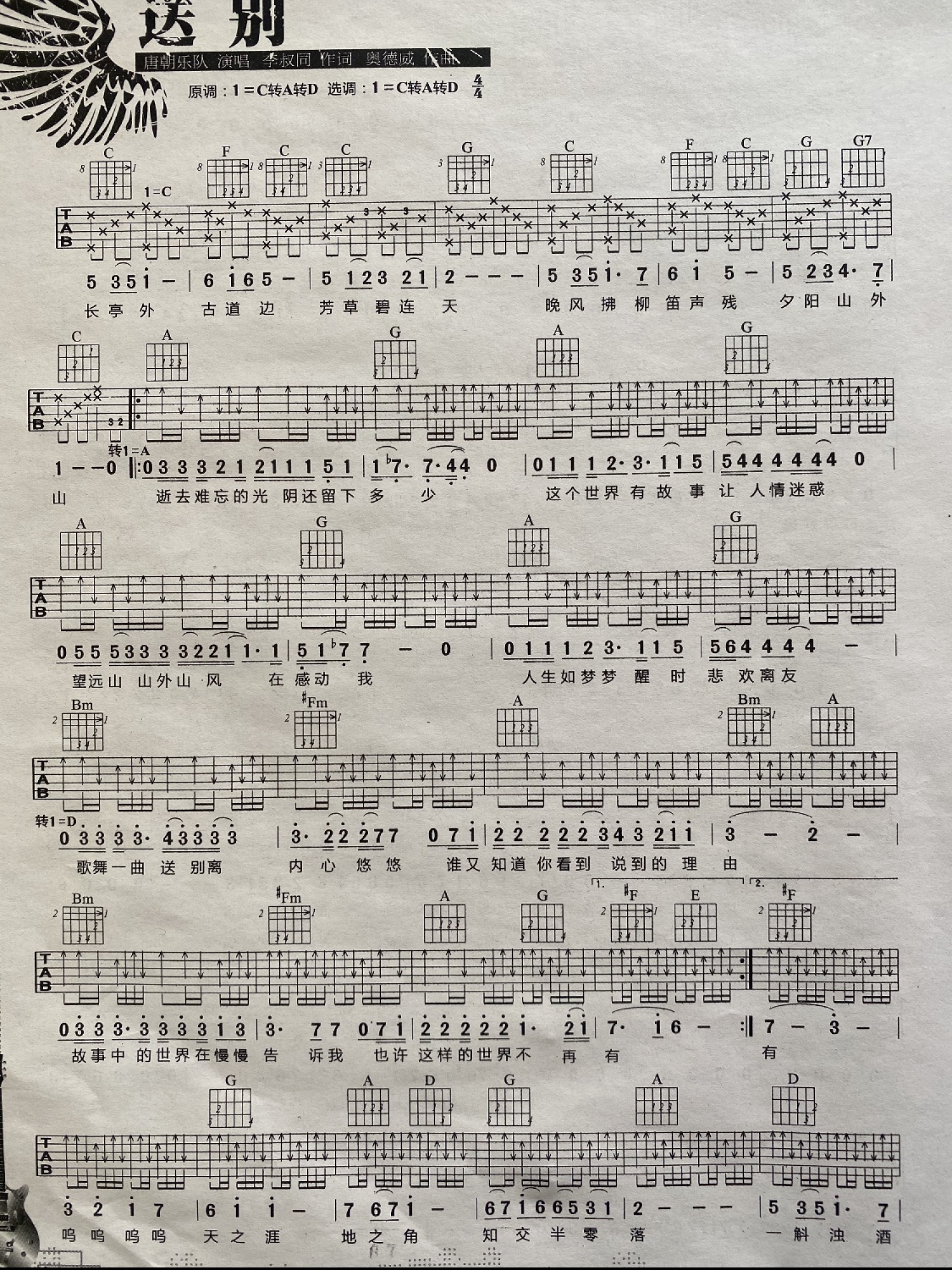 送别吉他谱 - 唐朝乐队 - C调吉他弹唱谱